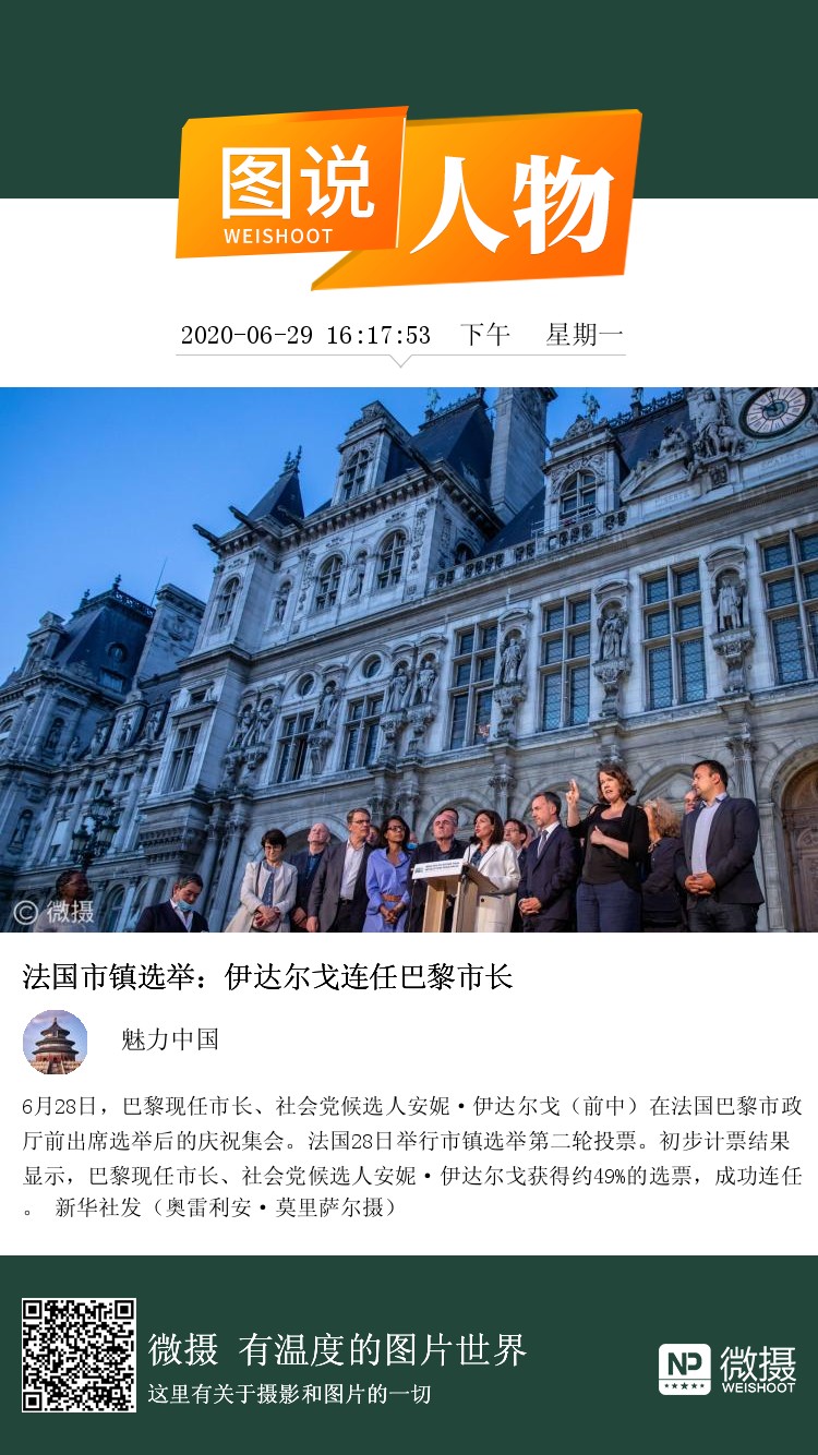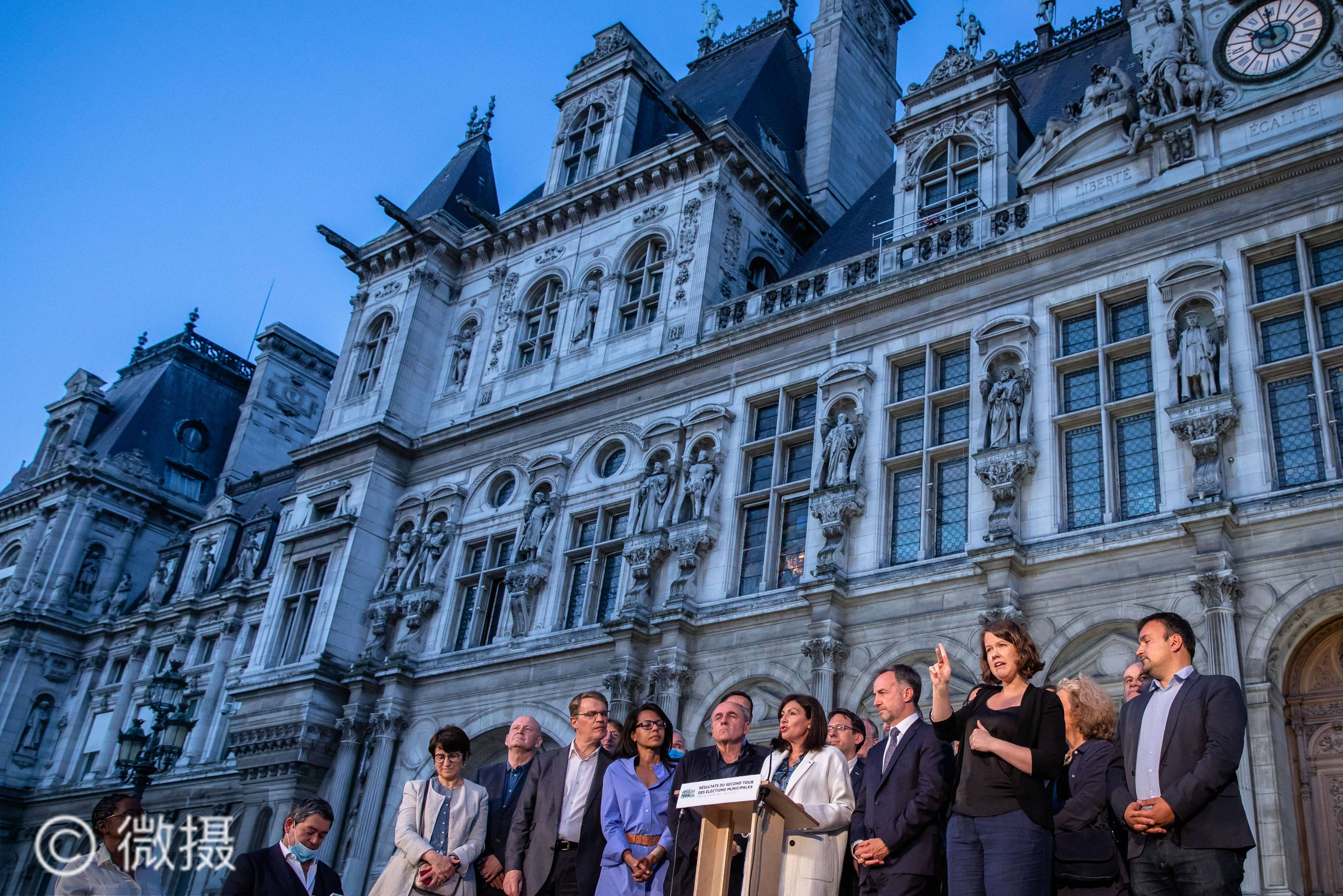 6月28日,巴黎现任市长、社会党候选人安妮·伊达尔戈(前中)在法国巴黎市政厅前出席选举后的庆祝集会。法国28日举行市镇选举第二轮投票。初步计票结果显示,巴黎现任市长、社会党候选人安妮·伊达尔戈获得约49%的选票,成功连任。 新华社发(奥雷利安·莫里萨尔摄)
