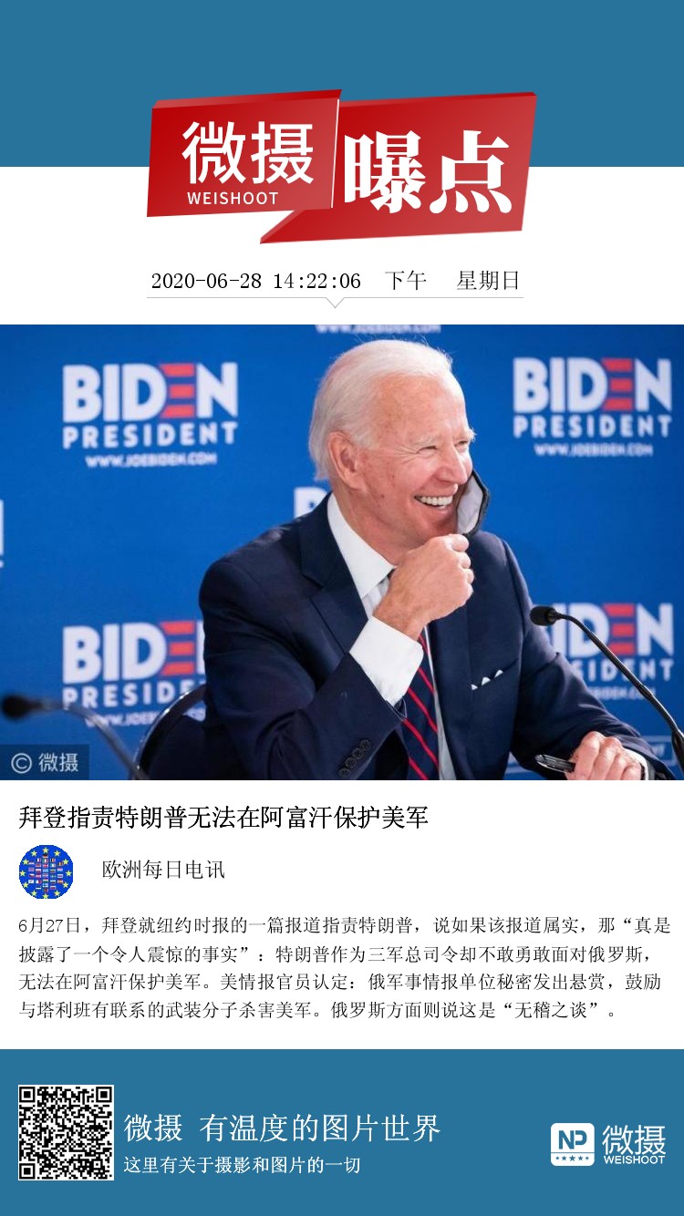 6月27日,拜登就纽约时报的一篇报道指责特朗普,说如果该报道属实,那“真是披露了一个令人震惊的事实”:特朗普作为三军总司令却不敢勇敢面对俄罗斯,无法在阿富汗保护美军。美情报官员认定:俄军事情报单位秘密发出悬赏,鼓励与塔利班有联系的武装分子杀害美军。俄罗斯方面则说这是“无稽之谈”。