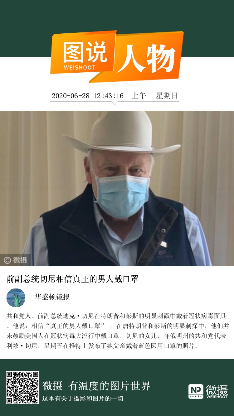 共和党人、前副总统迪克·切尼在特朗普和彭斯的明显刺戳中戴着冠状病毒面具。他说:相信“真正的男人戴口罩” 。在唐特朗普和彭斯的明显刺探中,他们并未鼓励美国人在冠状病毒大流行中戴口罩。切尼的女儿,怀俄明州的共和党代表利兹·切尼,星期五在推特上发布了她父亲戴着蓝色医用口罩的照片。