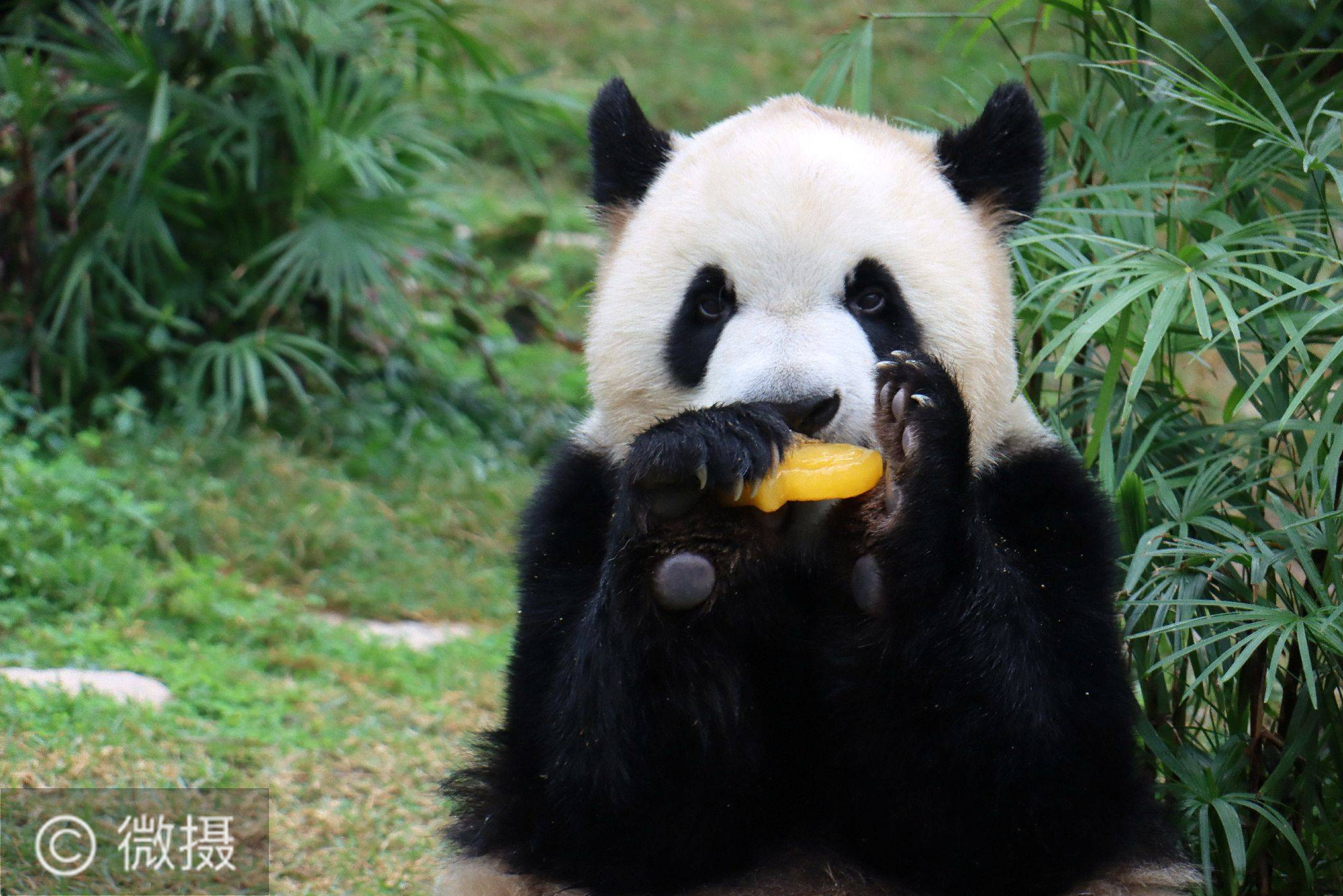 6月26日,大熊猫“康康”在享用水果雪条。当日,中央政府赠送澳门特区政府的大熊猫“开开”“心心”的双胞胎儿子“健健”“康康”迎来4周岁生日。饲养员用水果制作美味的冰蛋糕,为“健健”“康康”送上祝福。新华社发