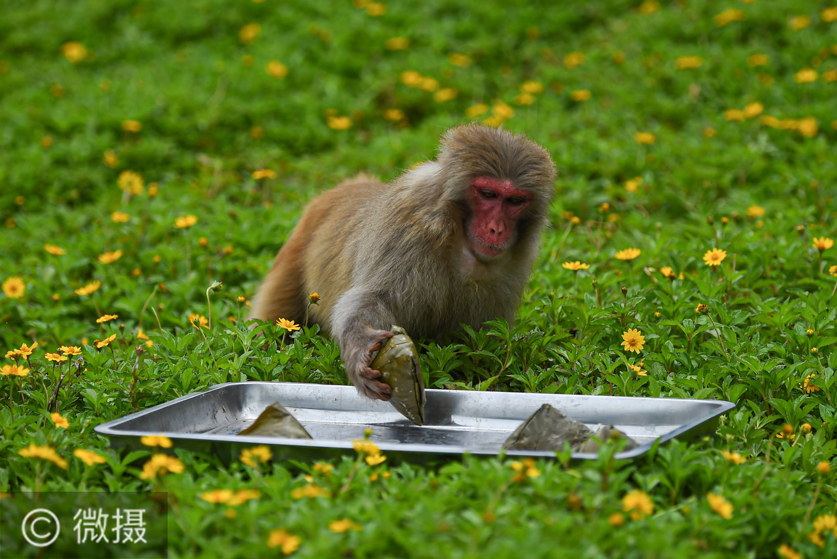 6月25日,海南热带野生动植物园的猕猴在拿取工作人员投放的“粽子”。当日是端午节,位于海口市的海南热带野生动植物园根据动物的喜好,特制了“粽子”及龙舟造型的食物和玩具,让动物们也乐享端午佳节。新华社记者 蒲晓旭 摄