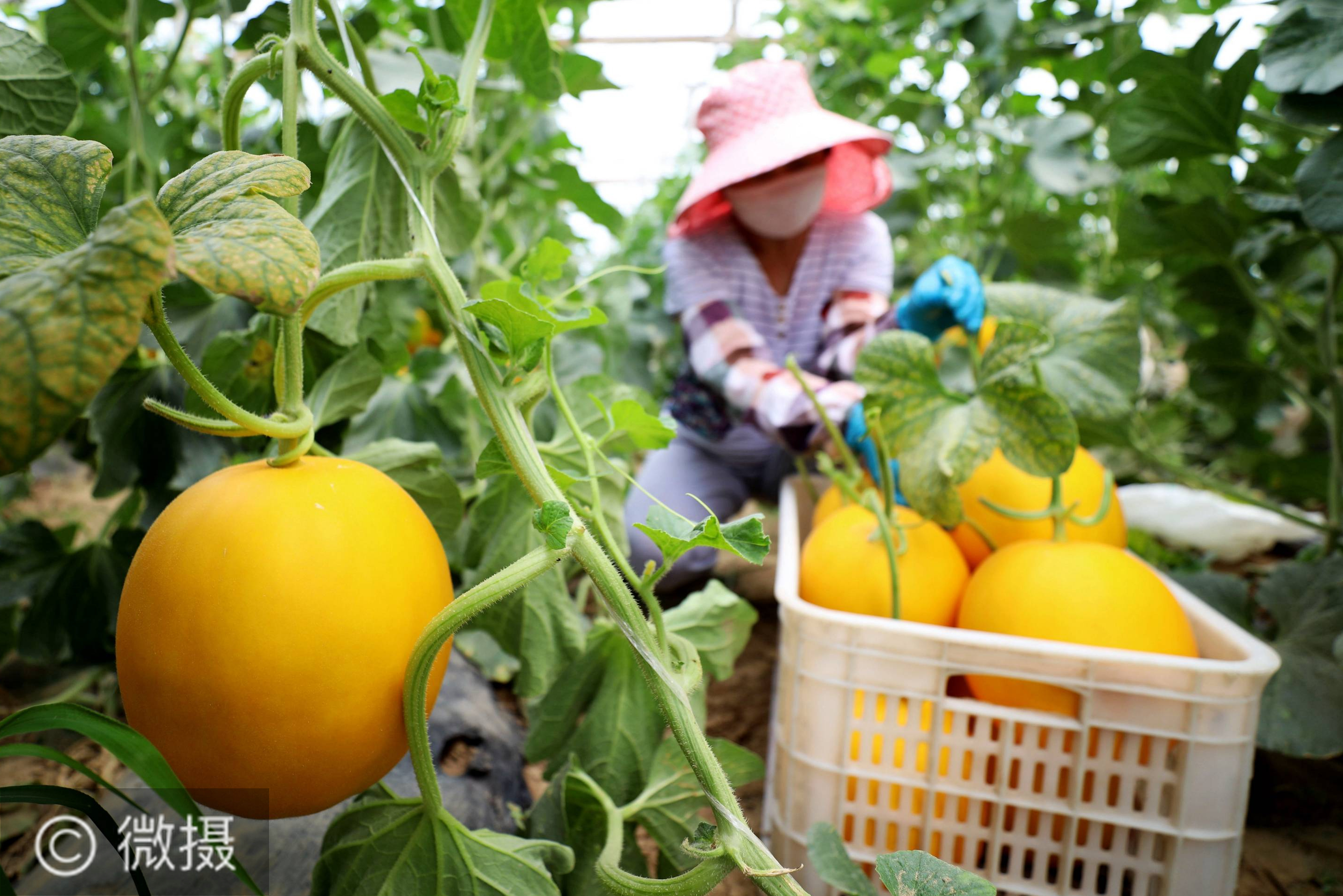 6月24日,廊坊市安次区渠成农业开发有限公司工人在大棚内收获蜜瓜。河北廊坊市临近北京,是北京重要的蔬菜瓜果供应基地。近日,河北省廊坊市多地加紧蔬菜瓜果采摘、打包、调运,全力保障北京“菜篮子”稳定供应。新华社记者 王晓 摄