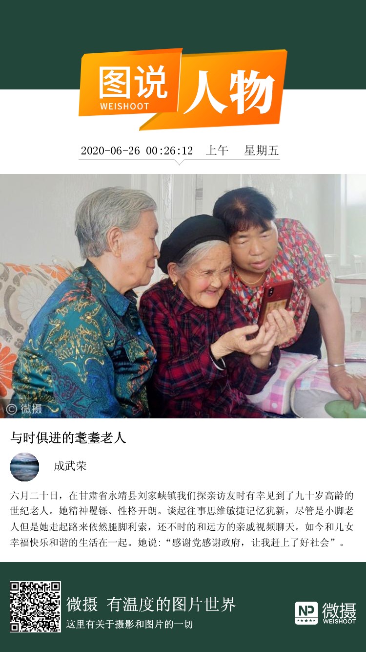 六月二十日,在甘肃省永靖县刘家峡镇我们探亲访友时有幸见到了九十岁高龄的世纪老人。她精神矍铄、性格开朗。谈起往事思维敏捷记忆犹新,尽管是小脚老人但是她走起路来依然腿脚利索,还不时的和远方的亲戚视频聊天。如今和儿女幸福快乐和谐的生活在一起。她说:“感谢党感谢政府,让我赶上了好社会”。