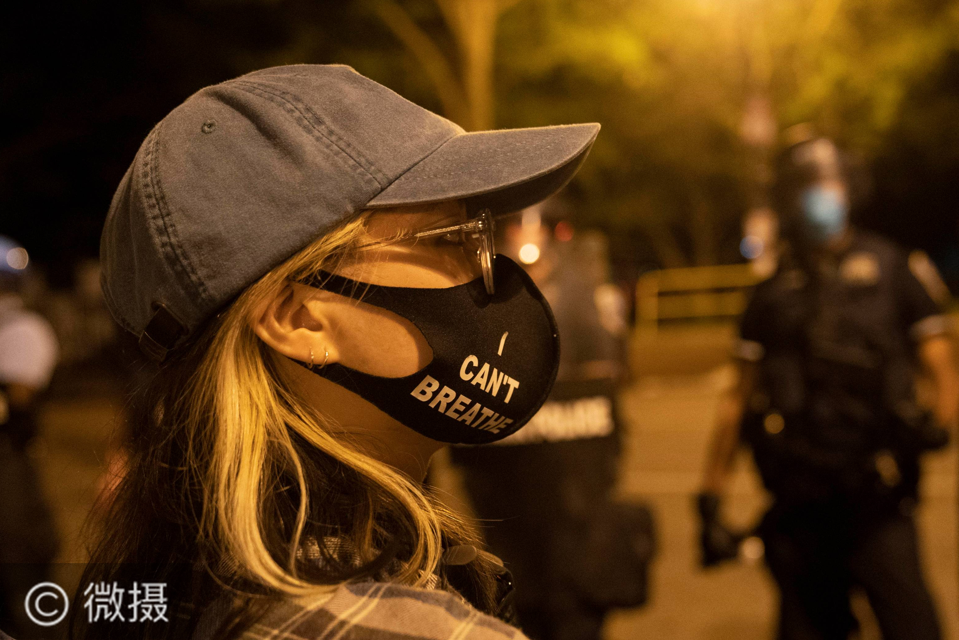 6月22日,一名女子戴着写有“我不能呼吸”的口罩在美国华盛顿白宫附近参加示威活动。美国警察和示威者22日晚在首都华盛顿白宫北侧拉斐特广场发生冲突并对峙。美国总统特朗普在社交媒体上说,许多人因破坏广场上美国前总统安德鲁·杰克逊的雕像及附近圣约翰圣公会教堂被逮捕。新华社记者 刘杰摄