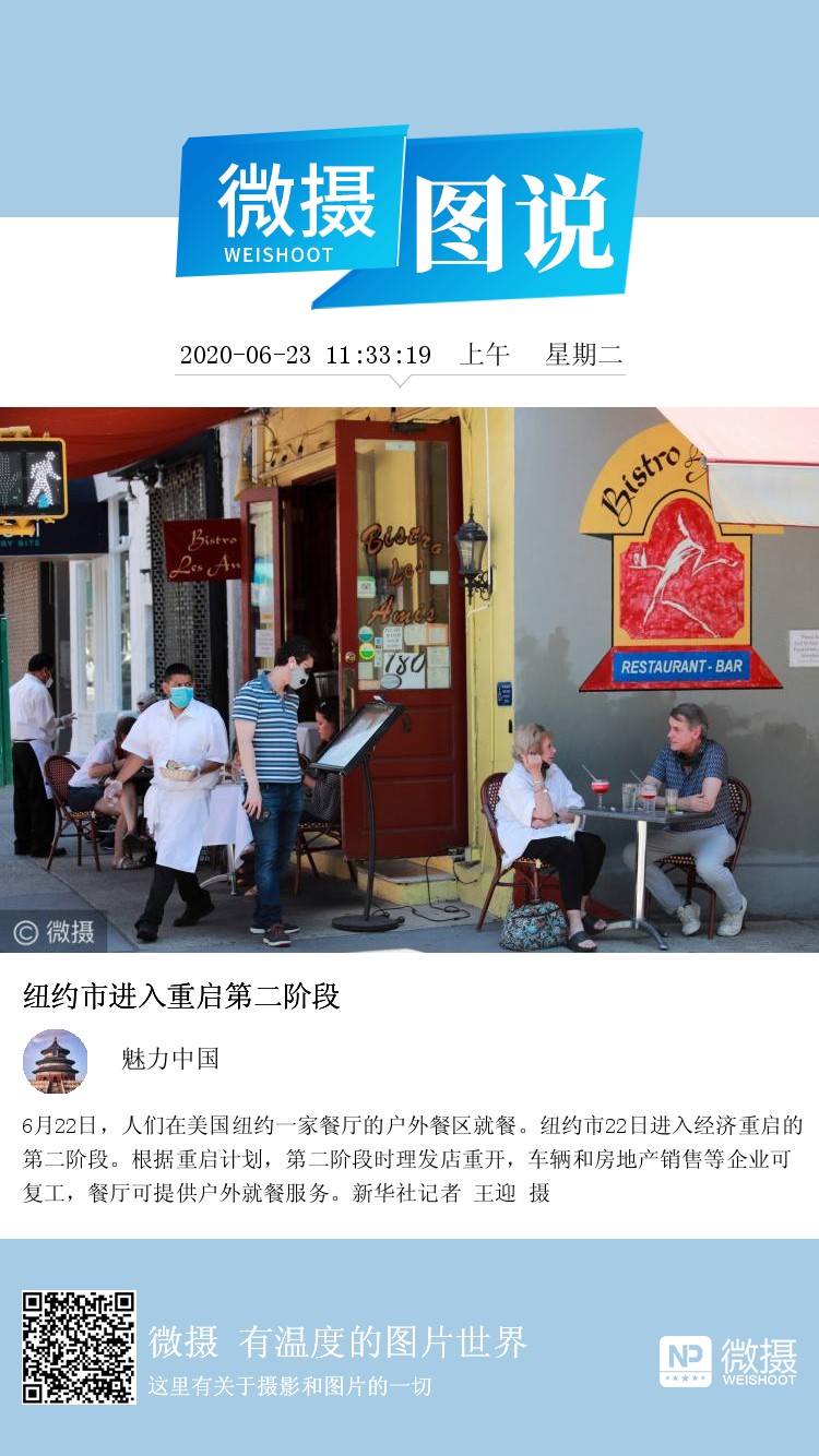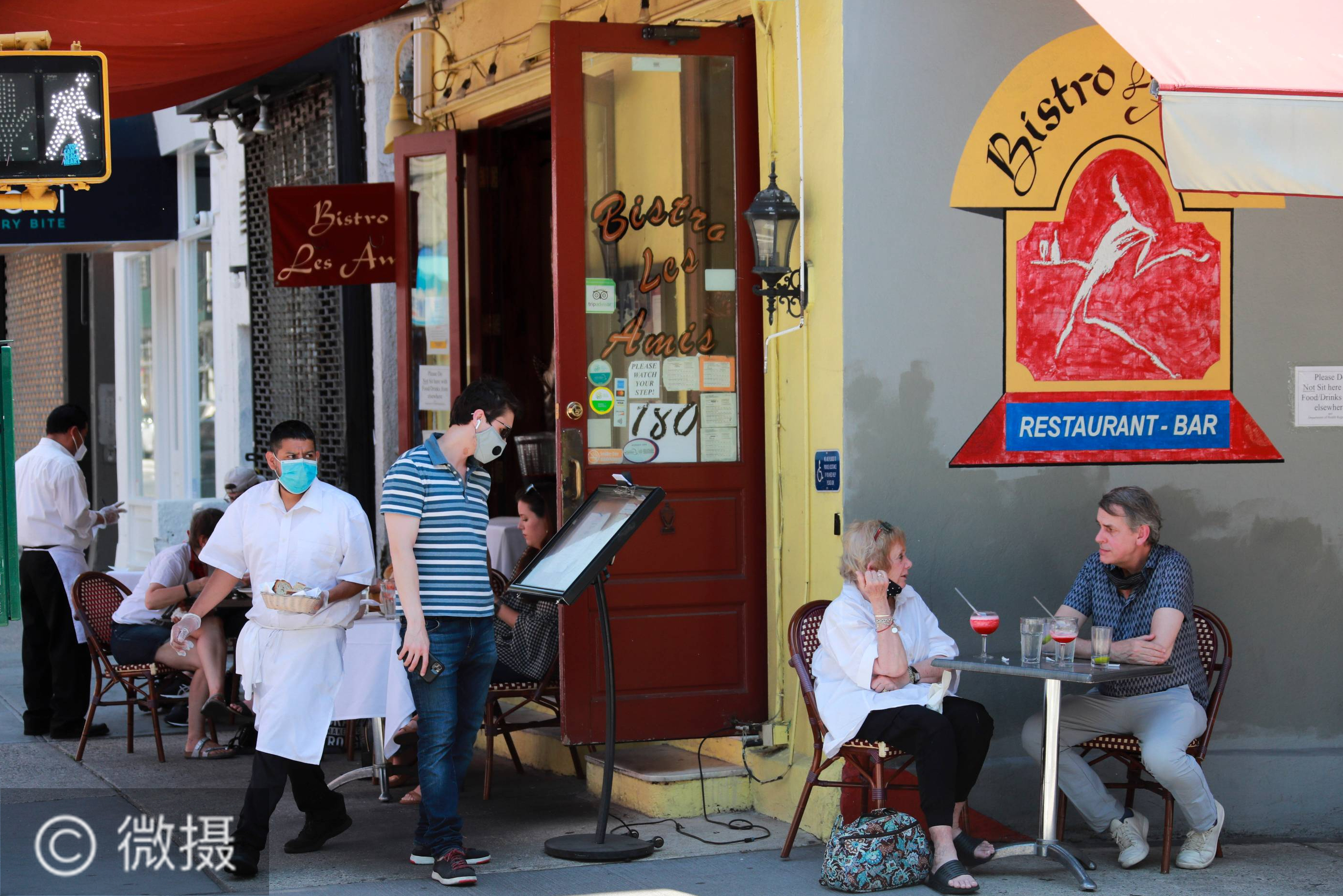 6月22日,人们在美国纽约一家餐厅的户外餐区就餐。纽约市22日进入经济重启的第二阶段。根据重启计划,第二阶段时理发店重开,车辆和房地产销售等企业可复工,餐厅可提供户外就餐服务。新华社记者 王迎 摄