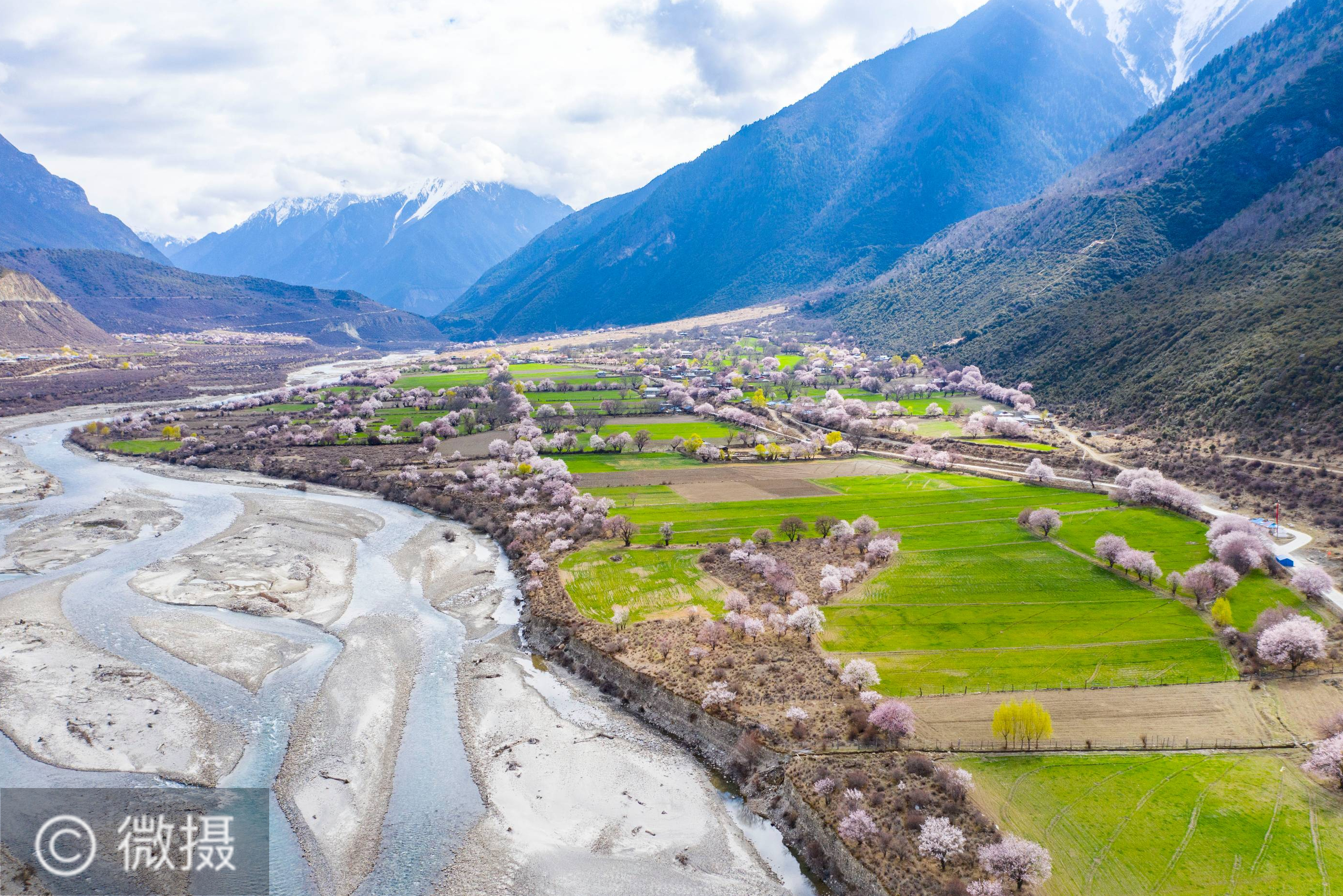 西藏林芝市波密县境内桃花盛开的田园风光(3月26日摄,无人机照片)。实施乡村振兴战略,是党的十九大作出的重大决策部署。各地践行“绿水青山就是金山银山”理念,在发展农业生产、推动农村经济社会发展的同时,注重保护生态环境,让优美风景成为乡村的美丽资源。新华社记者 普布扎西 摄