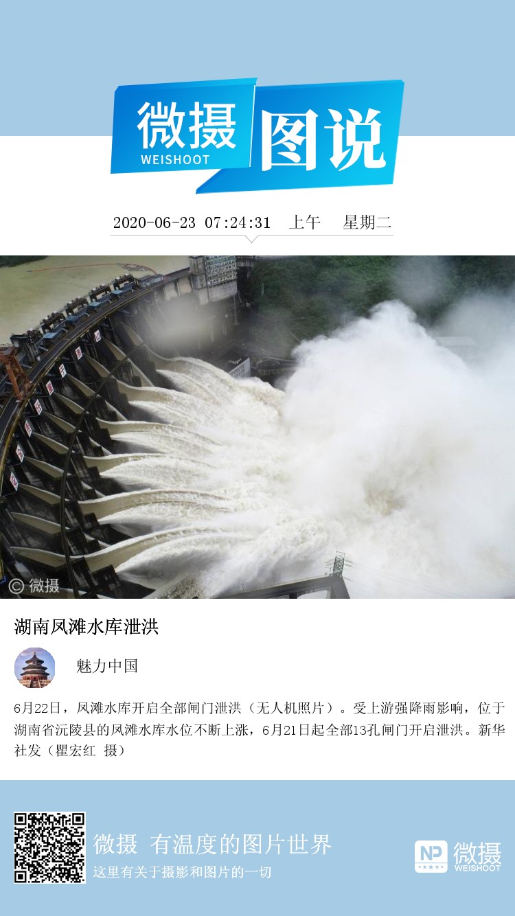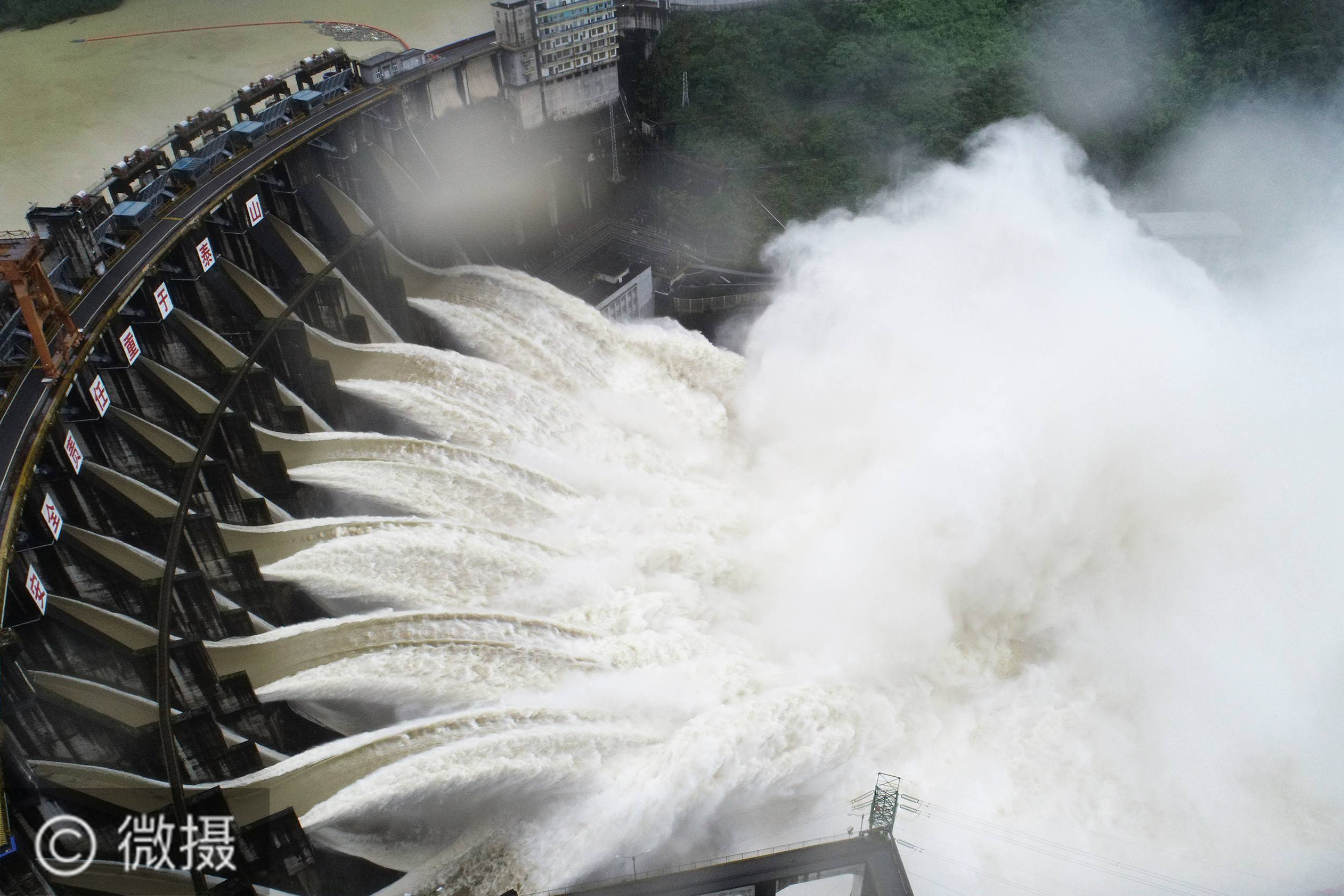 6月22日,凤滩水库开启全部闸门泄洪(无人机照片)。受上游强降雨影响,位于湖南省沅陵县的凤滩水库水位不断上涨,6月21日起全部13孔闸门开启泄洪。新华社发(瞿宏红 摄)