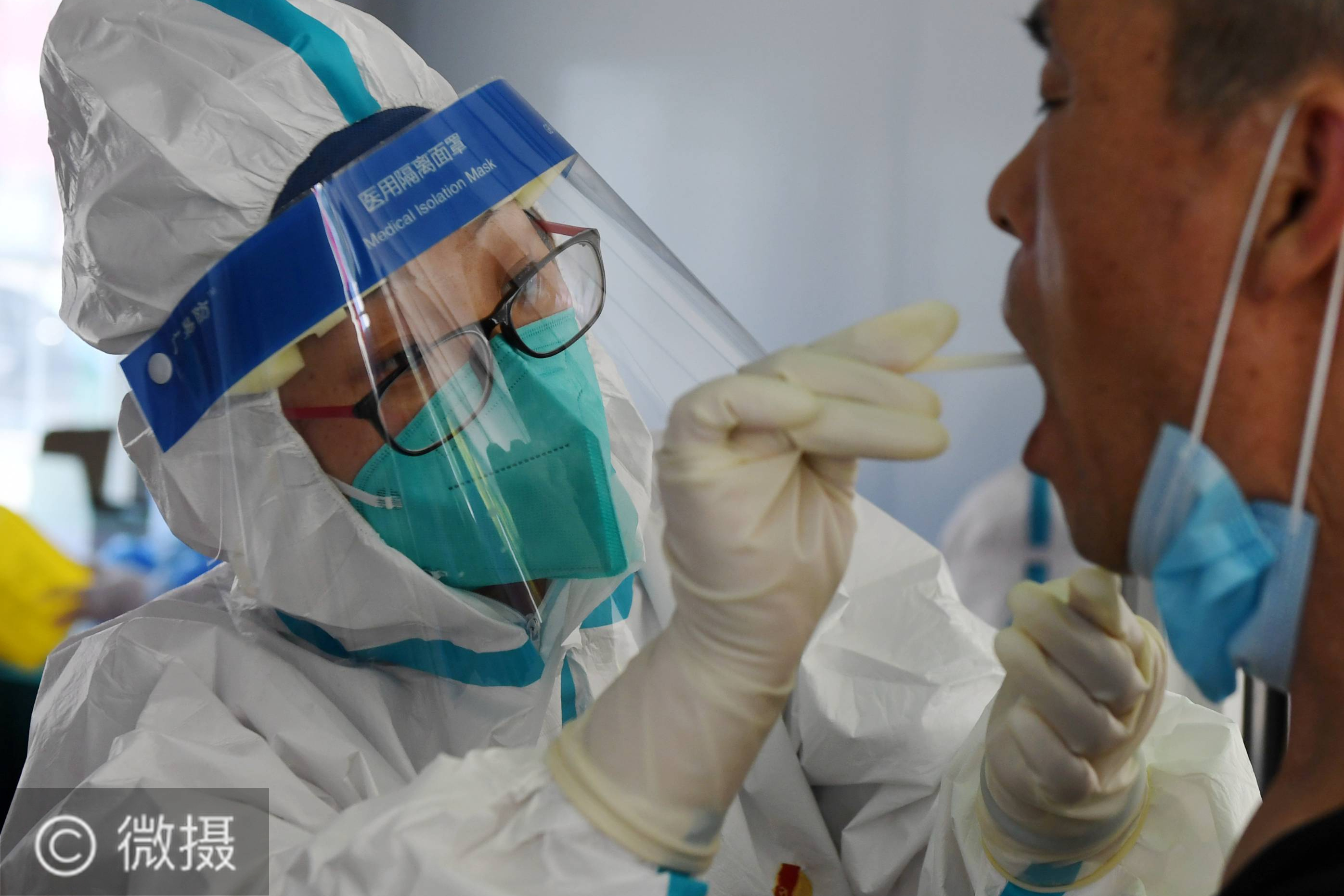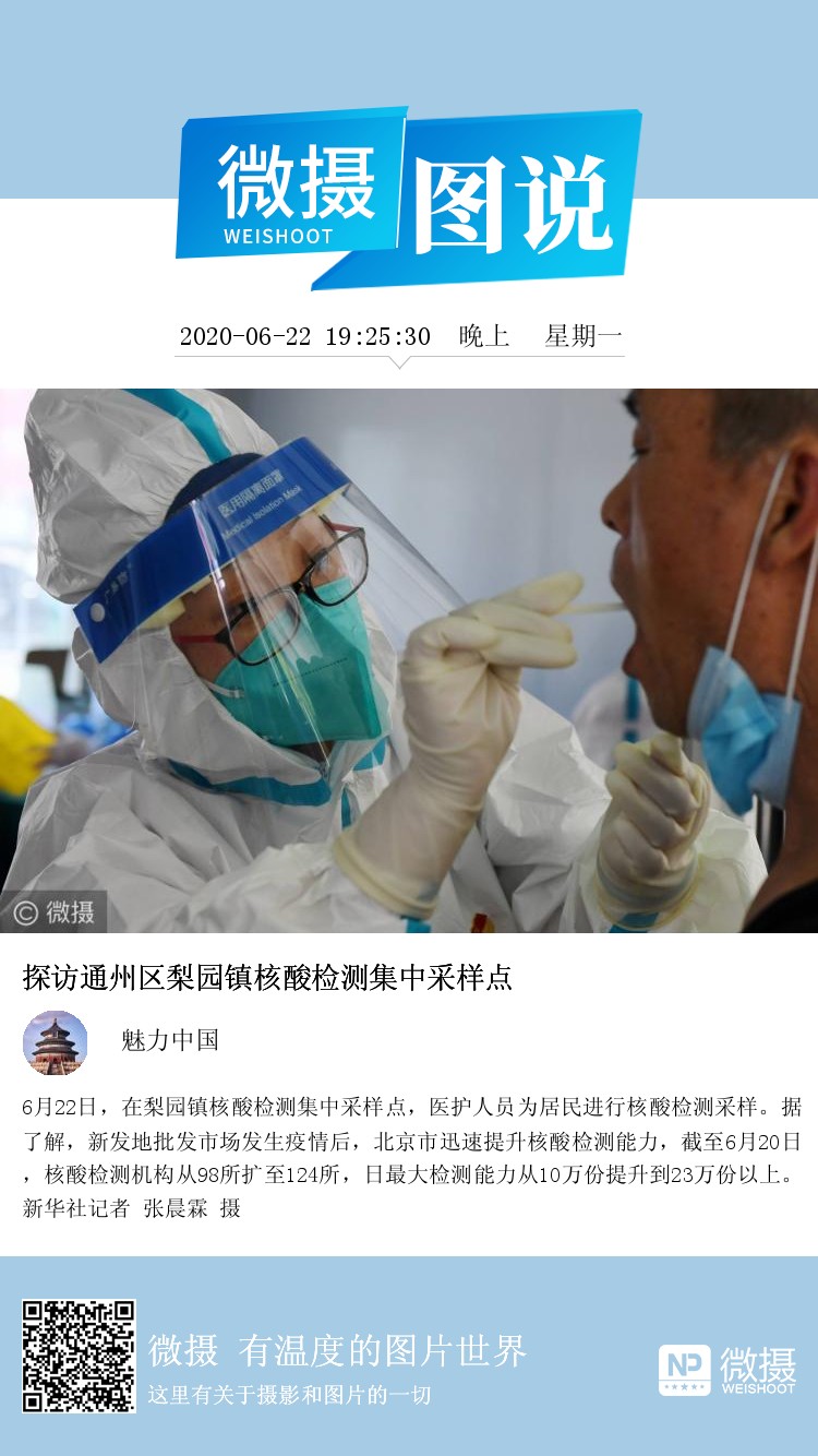 6月22日,在梨园镇核酸检测集中采样点,医护人员为居民进行核酸检测采样。据了解,新发地批发市场发生疫情后,北京市迅速提升核酸检测能力,截至6月20日,核酸检测机构从98所扩至124所,日最大检测能力从10万份提升到23万份以上。新华社记者 张晨霖 摄