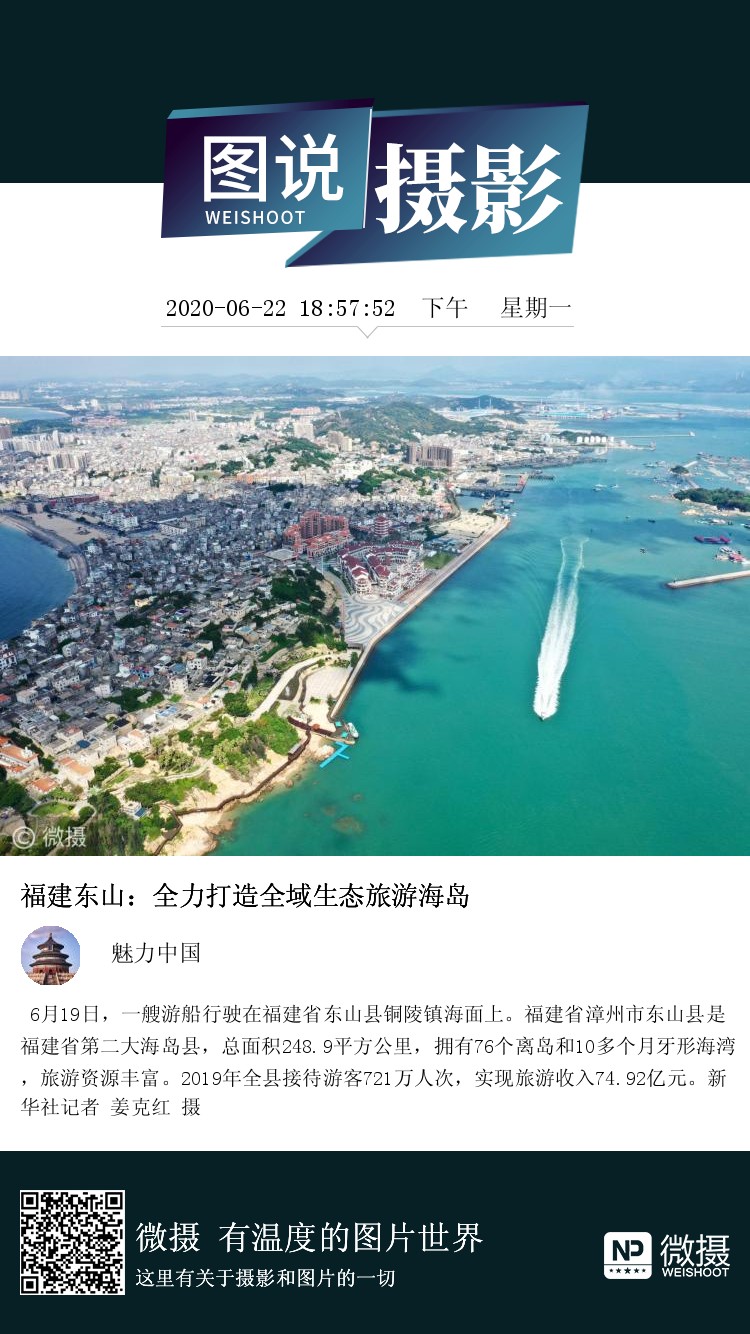 6月19日,一艘游船行驶在福建省东山县铜陵镇海面上。福建省漳州市东山县是福建省第二大海岛县,总面积248.9平方公里,拥有76个离岛和10多个月牙形海湾,旅游资源丰富。2019年全县接待游客721万人次,实现旅游收入74.92亿元。新华社记者 姜克红 摄