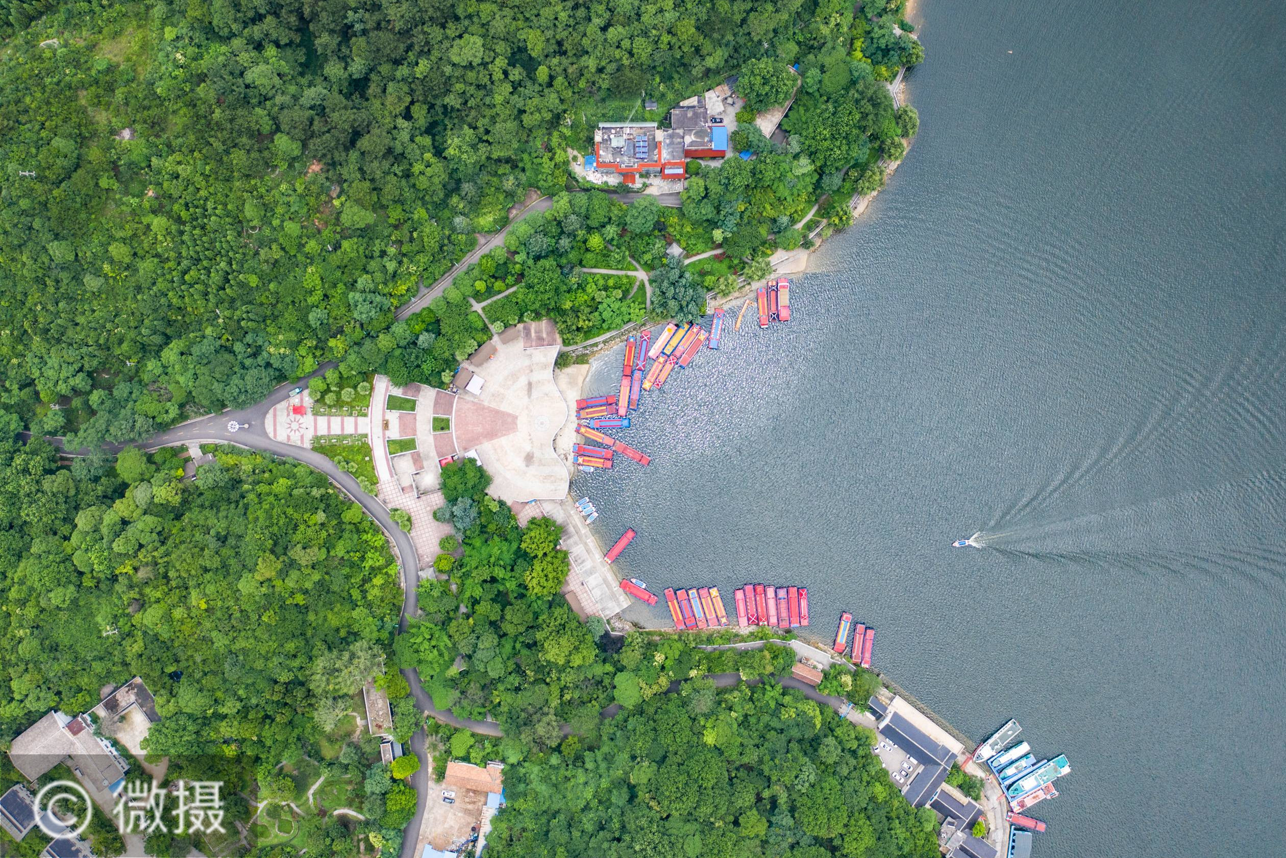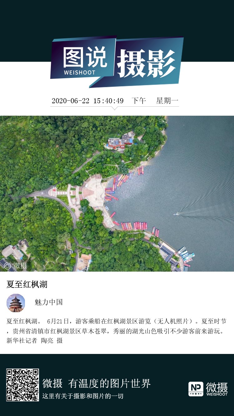 夏至红枫湖。 6月21日,游客乘船在红枫湖景区游览(无人机照片)。夏至时节,贵州省清镇市红枫湖景区草木苍翠,秀丽的湖光山色吸引不少游客前来游玩。新华社记者 陶亮 摄
