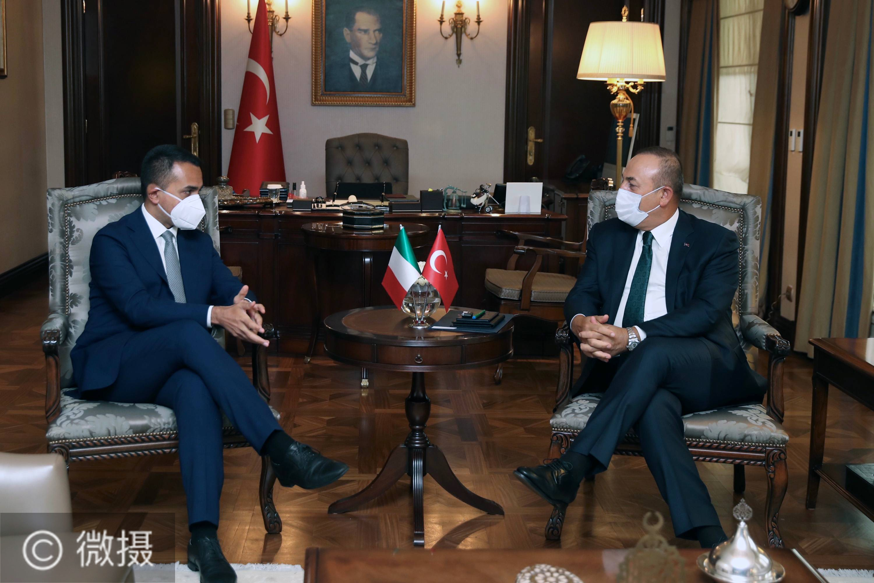 6月19日,在土耳其首都安卡拉,土耳其外长恰武什奥卢(右)会见到访的意大利外长迪马约。土耳其外长恰武什奥卢19日表示,土耳其和意大利将共同努力维护利比亚的和平。新华社发