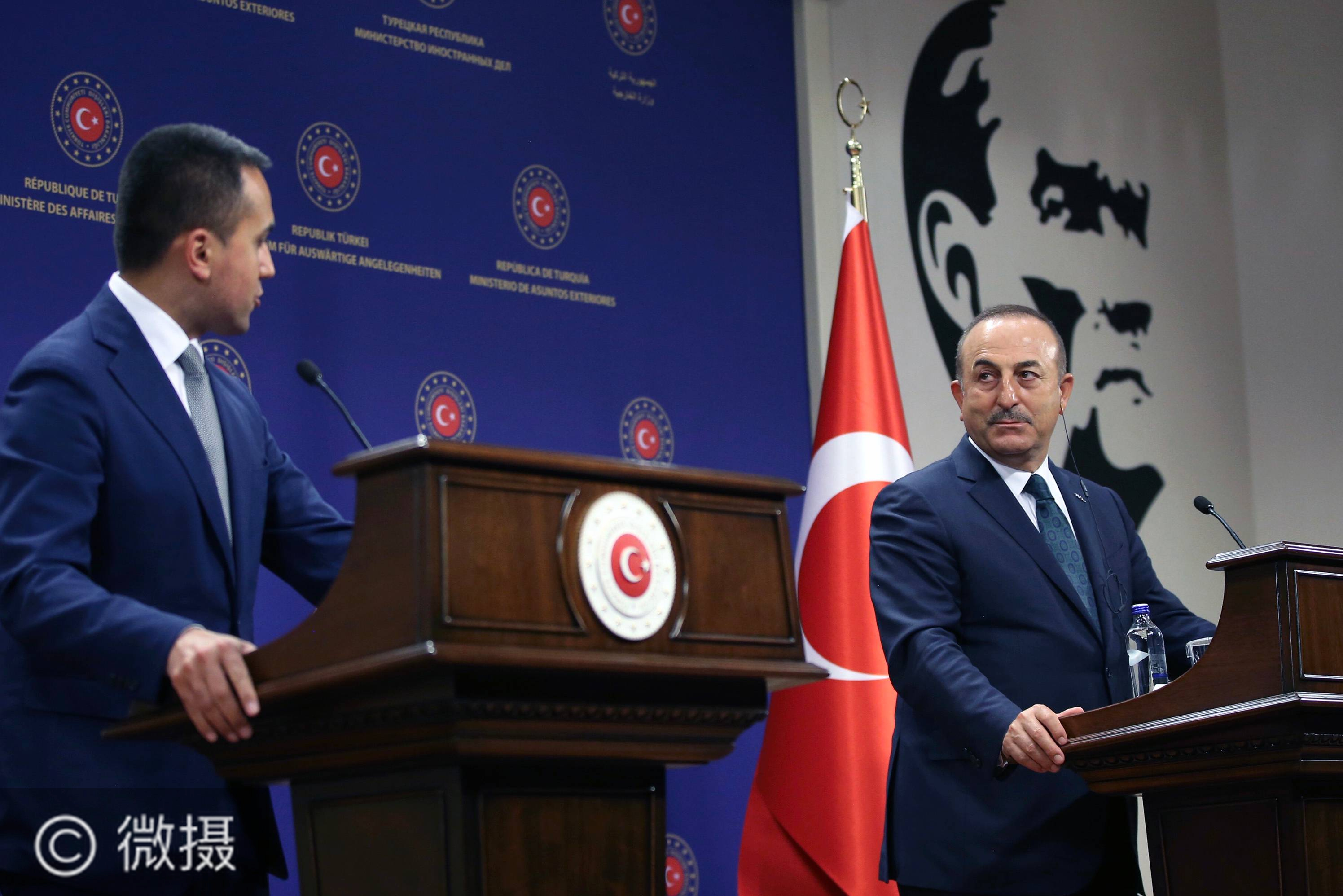 6月19日,在土耳其首都安卡拉,土耳其外长恰武什奥卢(右)与到访的意大利外长迪马约举行联合新闻发布会。土耳其外长恰武什奥卢19日表示,土耳其和意大利将共同努力维护利比亚的和平。新华社发
