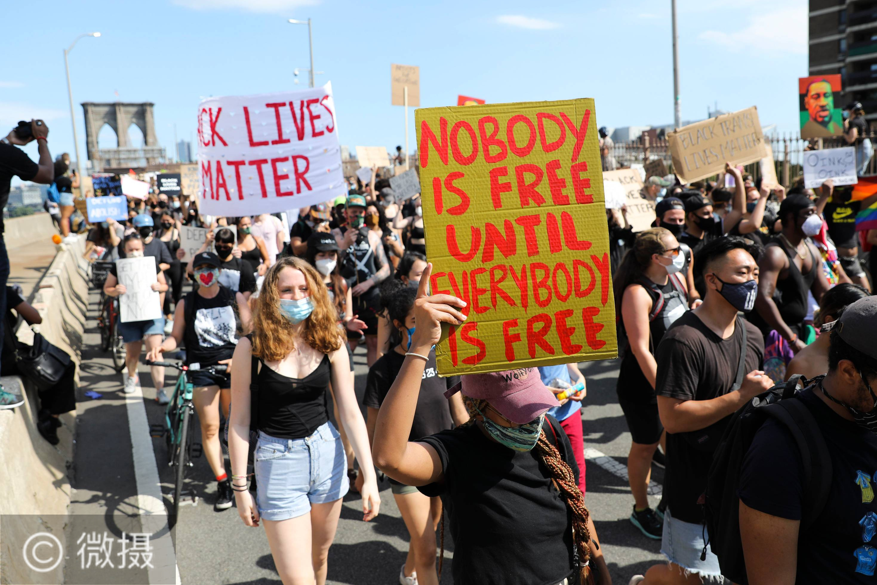 6月19日,游行队伍经过美国纽约布鲁克林大桥。6月19日是美国的“六月节”,又称自由日或解放日,被认为是标志美国奴隶制终结的日子。美国各地民众当日举行“六月节”集会游行,抗议警察暴力执法和种族歧视等问题。新华社记者 王迎 摄