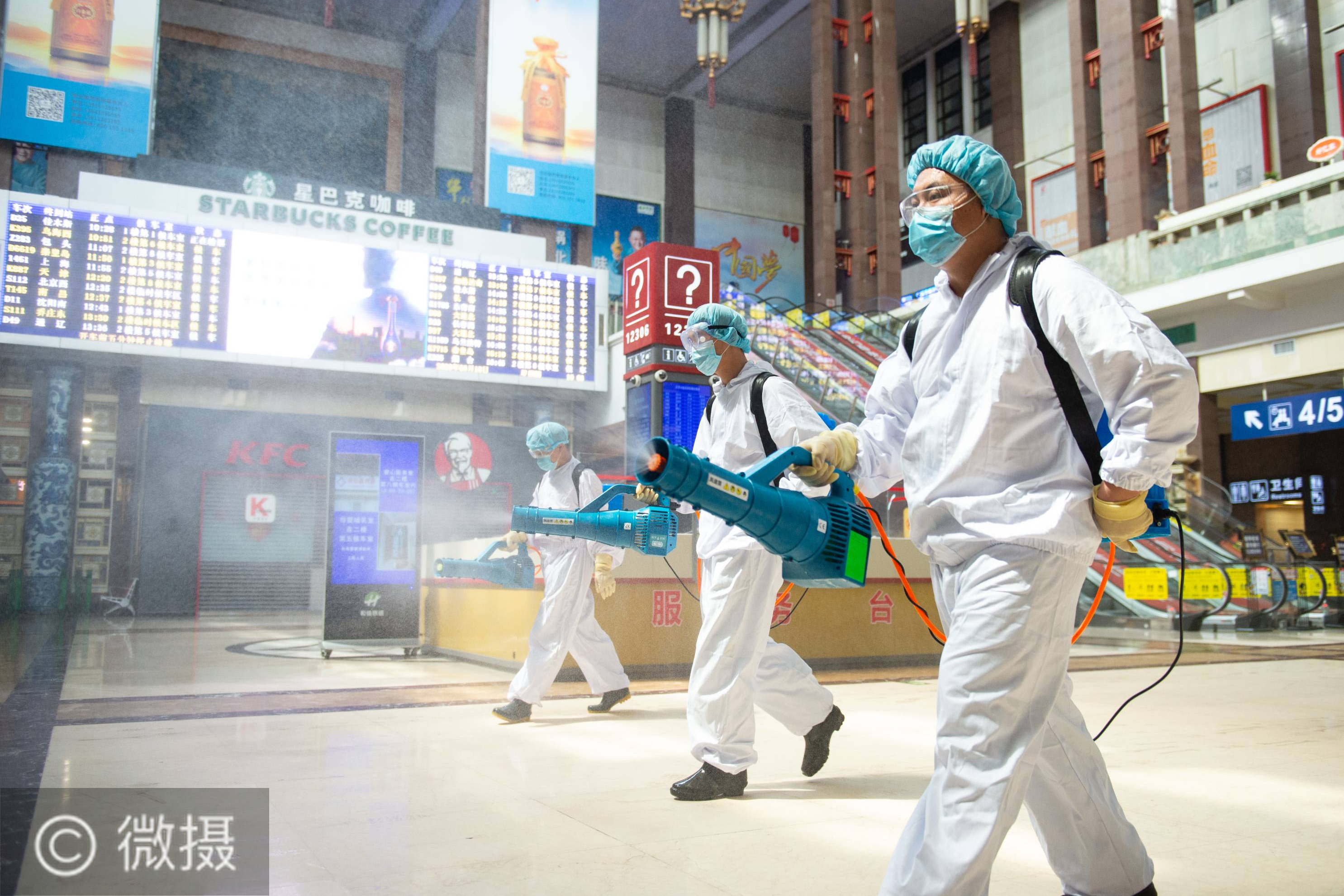 6月18日,北京站工作人员在候车大厅进行消杀作业。自6月16日北京市突发公共卫生应急响应级别由三级调至二级后,北京站加大防控力度,加强消杀、测温等工作,并根据客流情况,动态调整列车开行对数。新华社发(陈钟昊摄)