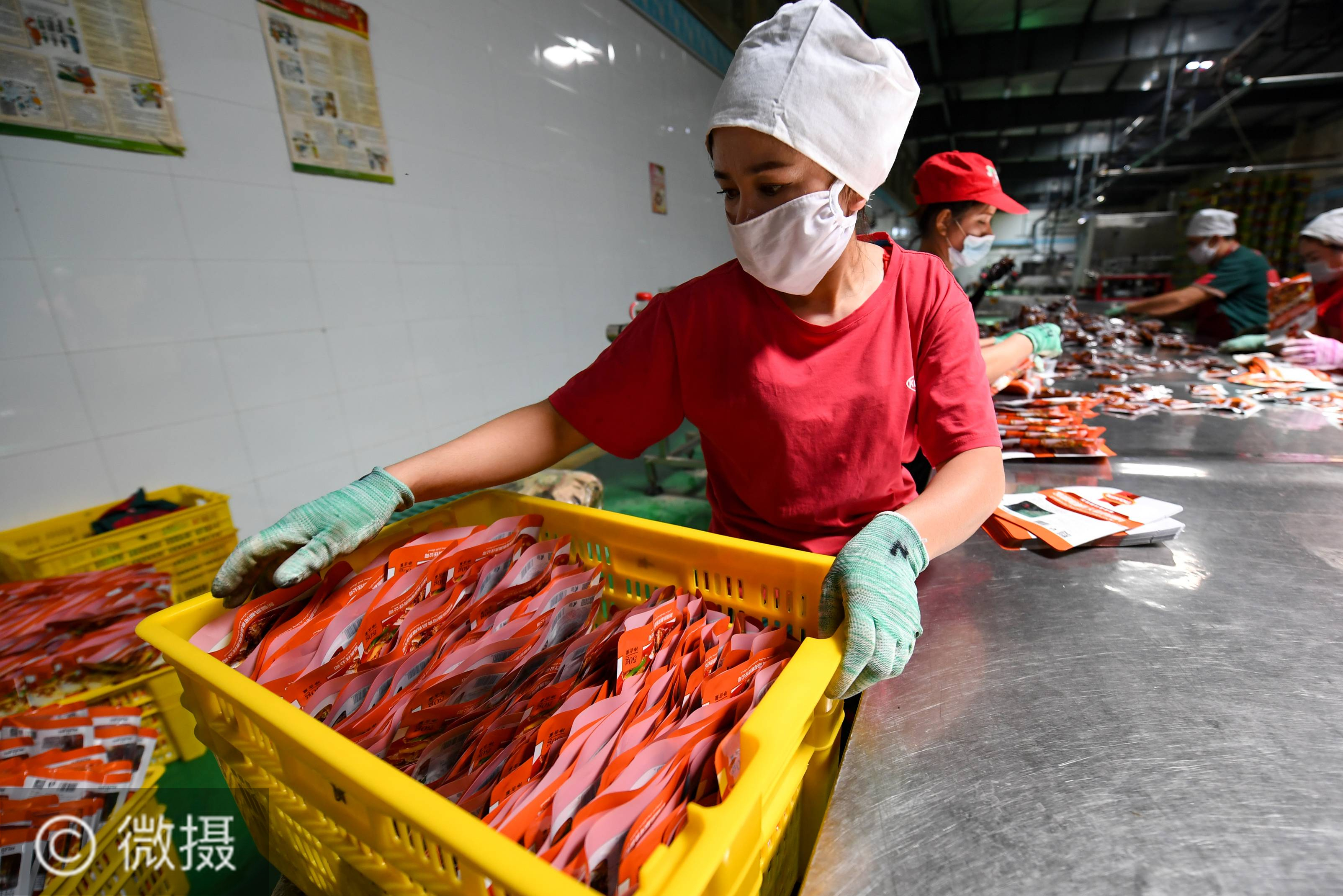 6月18日,在焉耆县新疆凯都河食品有限责任公司,工人在包装调味料。新疆巴音郭楞蒙古自治州焉耆县利用光照充足、昼夜温差大、病虫害少等自然条件优势,大力发展红辣椒、红番茄、红酒“三红”产业,提高特色农产品加工转化率,完善产业链条。新华社记者 宋彦桦 摄