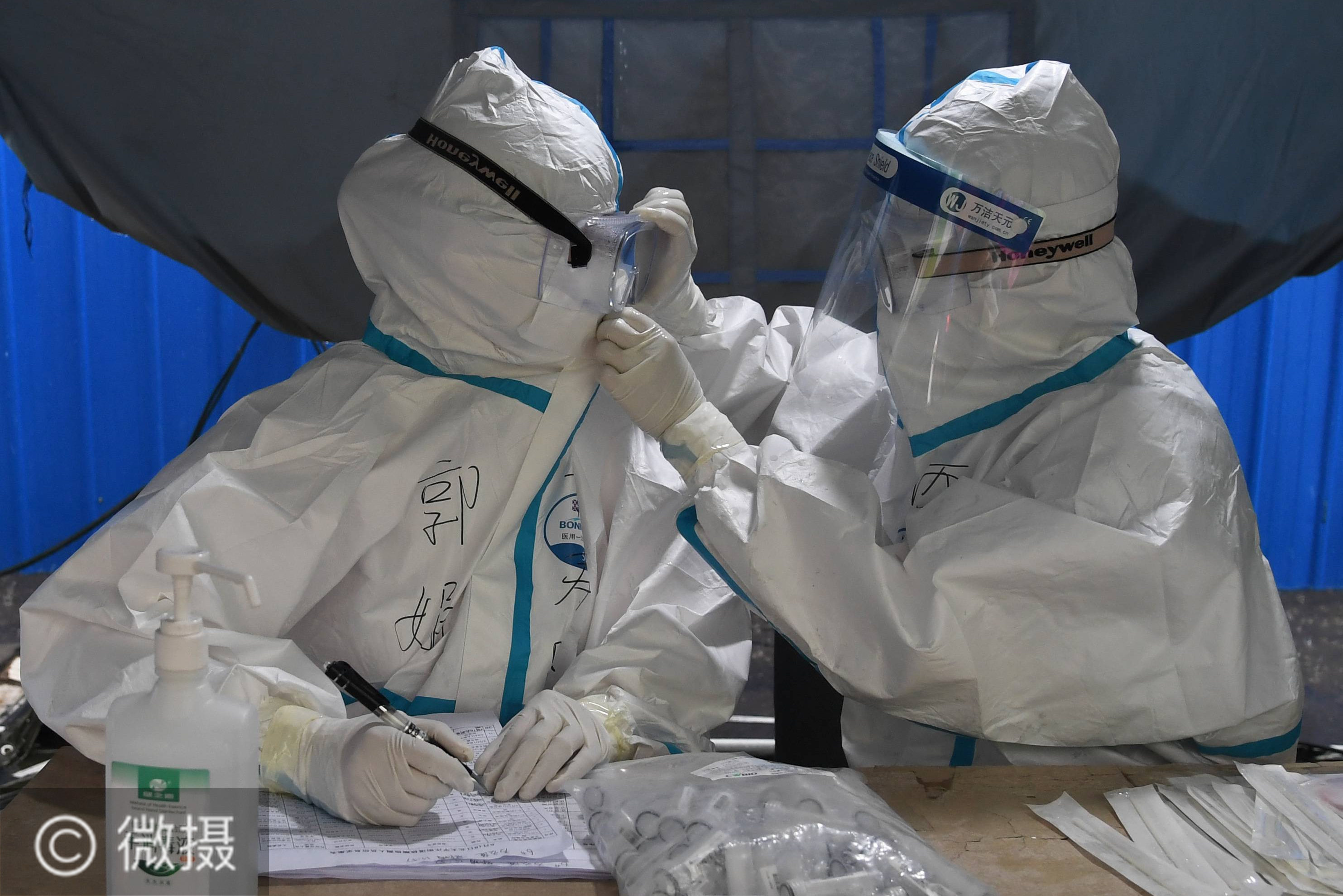 6月18日,在海淀区区级核酸检测采样点,医护人员帮同事整理护目镜。当日,北京出现降雨,在位于北京市海淀区的区级核酸检测采样点,工作人员坚守岗位,助力疫情防控。据介绍,目前海淀区29个街镇也在各自辖区设置了核酸检测采样点。新华社记者 任超 摄