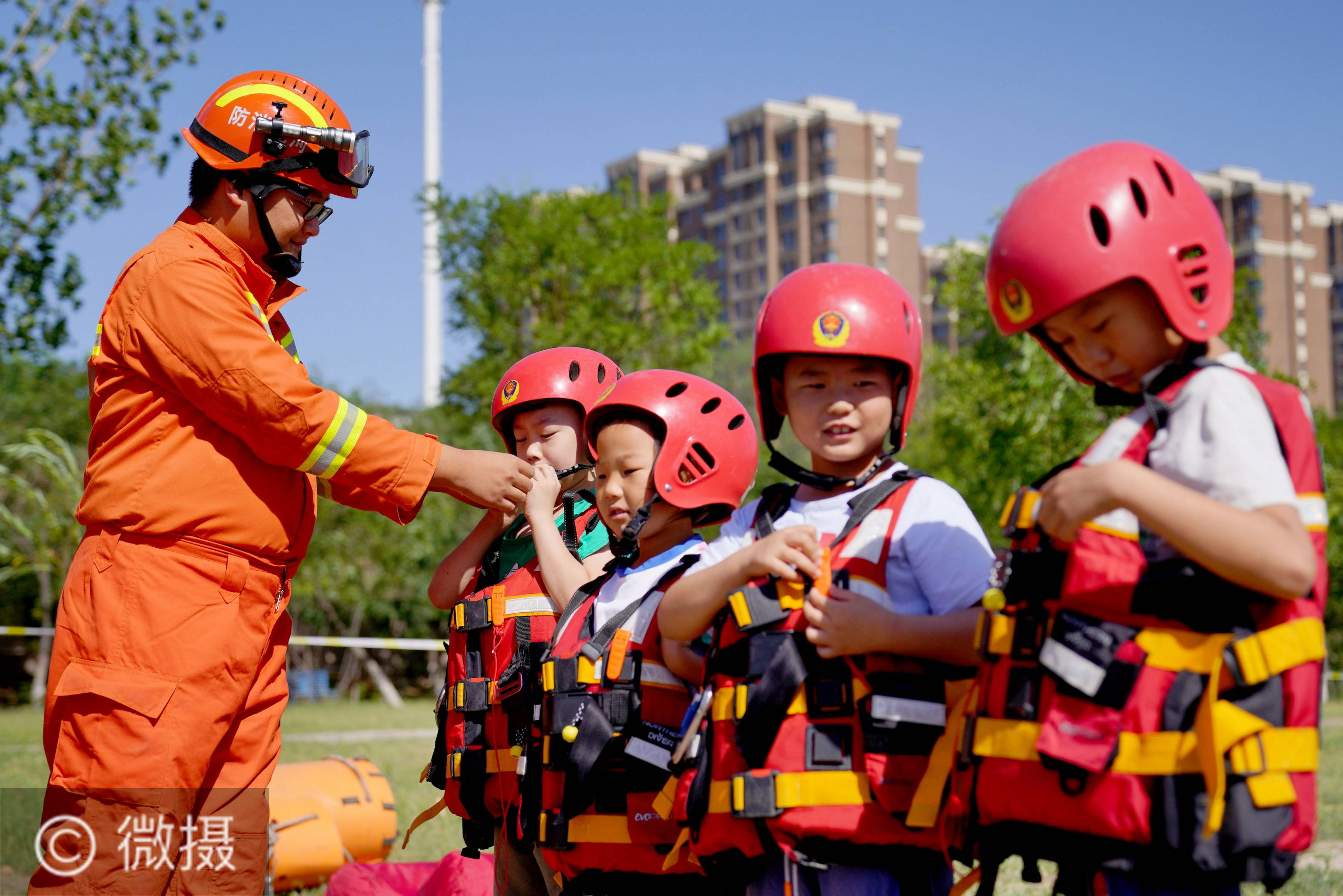 6月16日,河北省清河县消防救援大队工作人员为小朋友讲解救生衣和救生头盔使用知识。当日,河北省清河县开展“珍爱生命 预防溺水”安全教育活动,邀请当地消防救援人员、医护人员为群众讲解防溺水安全急救知识,提高群众的安全意识和自救自护能力。新华社记者 牟宇 摄