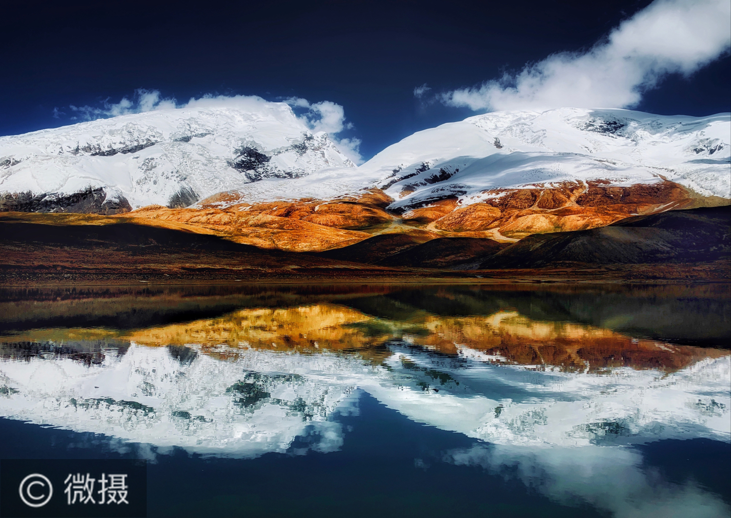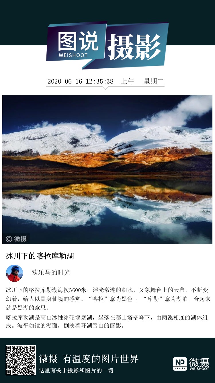 冰川下的喀拉库勒湖海拨3600米,浮光潋滟的湖水,又象舞台上的天幕,不断变幻着,给人以置身仙境的感觉。“喀拉”意为黑色 ,“库勒”意为湖泊,合起来就是黑湖的意思。 喀拉库勒湖是高山冰蚀冰碛堰塞湖,坐落在慕士塔格峰下,由两泓相连的湖体组成。波平如镜的湖面,倒映着环湖雪山的丽影。