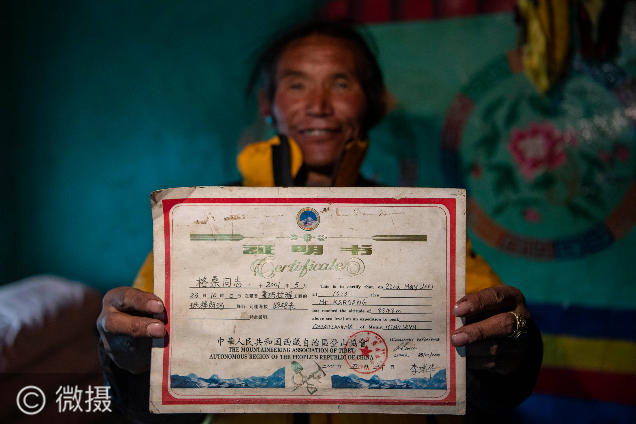 这是格桑向记者展示自己的珠峰登顶证书(1月21日摄)。2020珠峰高程测量期间,为保障峰顶信号质量,网络运营商需要将光纤铺设至海拔6500米的珠峰前进营地。格桑和其他村民一起,承担起运输光纤的任务。新华社记者孙非摄