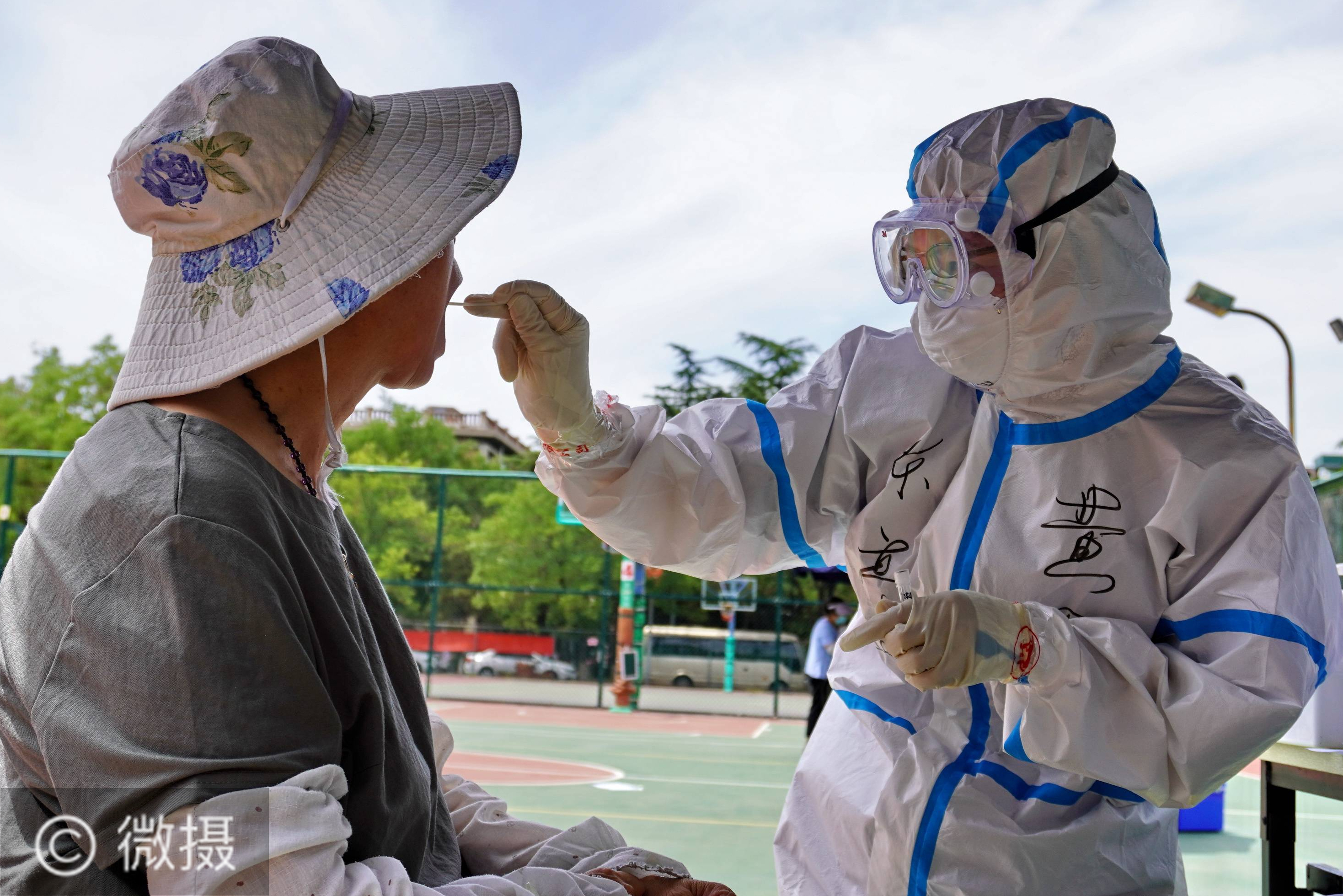 6月15日,北京市丰台区东高地街道采样点工作人员为市民做咽拭子采样。据北京组织部微信公众号6月15日消息,针对近日出现的疫情防控新情况,北京各区第一时间开展“敲门行动”,“地毯式”排查有关人员。新华社记者 李欣 摄