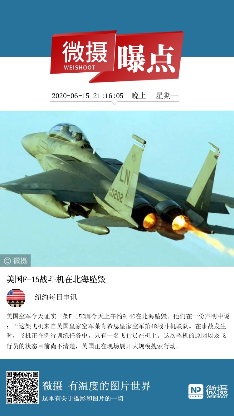 美国空军今天证实一架F-15C鹰今天上午约9.40在北海坠毁。他们在一份声明中说:“这架飞机来自英国皇家空军莱肯希思皇家空军第48战斗机联队。在事故发生时,飞机正在例行训练任务中,只有一名飞行员在机上。这次坠机的原因以及飞行员的状态目前尚不清楚,英国正在现场展开大规模搜索行动。