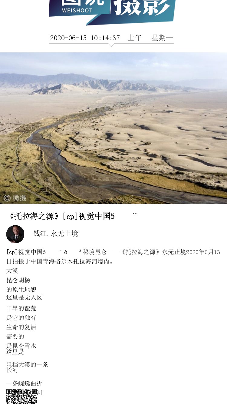 [cp]视觉中国🇨🇳秘境昆仑——《托拉海之源》永无止境2020年6月13日拍摄于中国青海格尔木托拉海河境内。 大漠 昆仑胡杨 的原生地貌 这里是无人区 干旱的蛮荒 是它的独有 生命的复活 需要的 是昆仑雪水 这里是 阻挡大漠的一条 长河 一条蜿蜒曲折 的托拉海之河