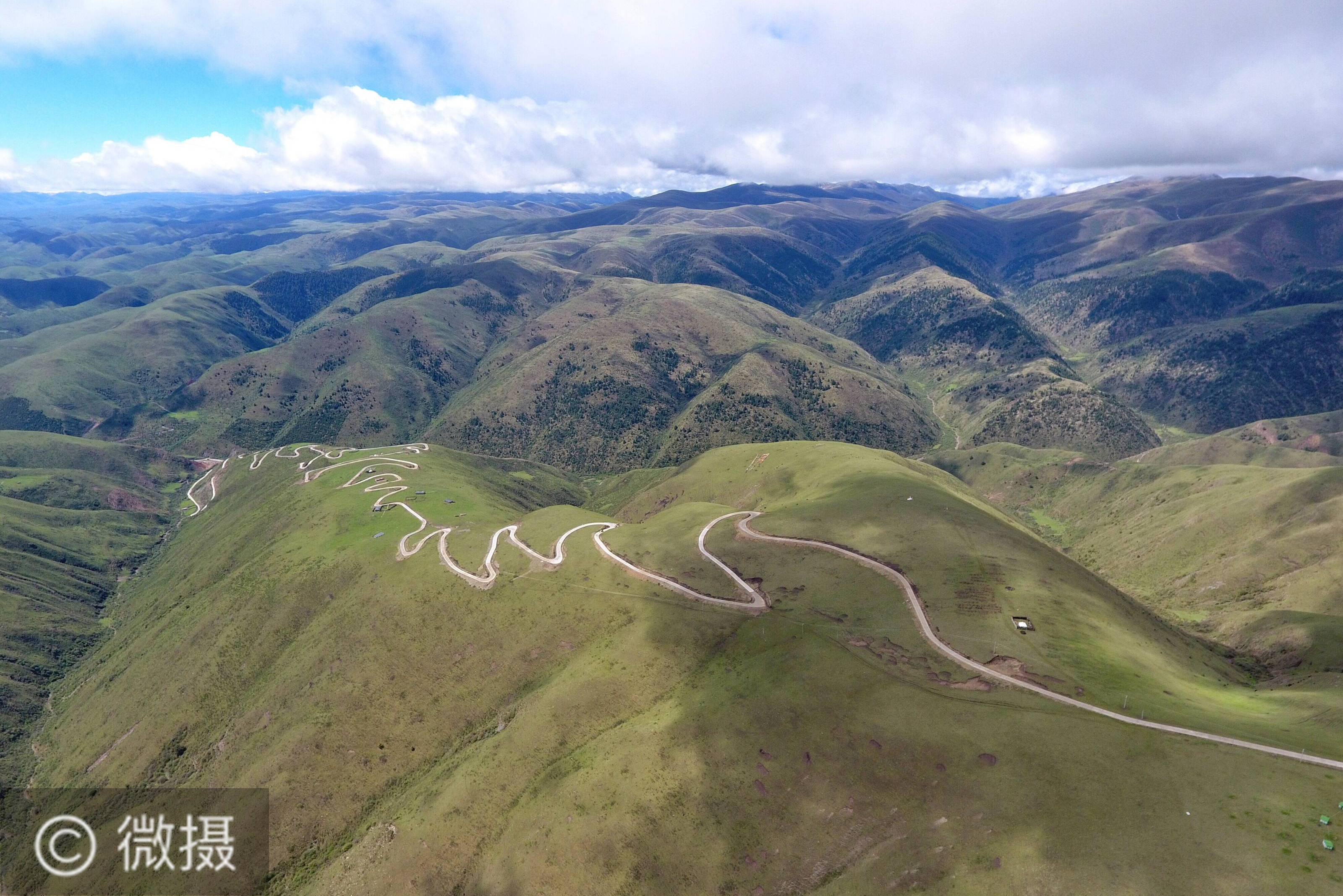 这是6月13日无人机航拍的“上南天路”。四川省阿坝藏族羌族自治州壤塘县的“上南天路”全长约34公里,总投资约5000万元,连通上杜柯乡和南木达镇,最高处海拔高度约4200米,预计2020年7月全线完工。因其沿线风光壮美,被称为“尚蓝天路”,成为壤塘一张靓丽名片。新华社记者刘坤摄