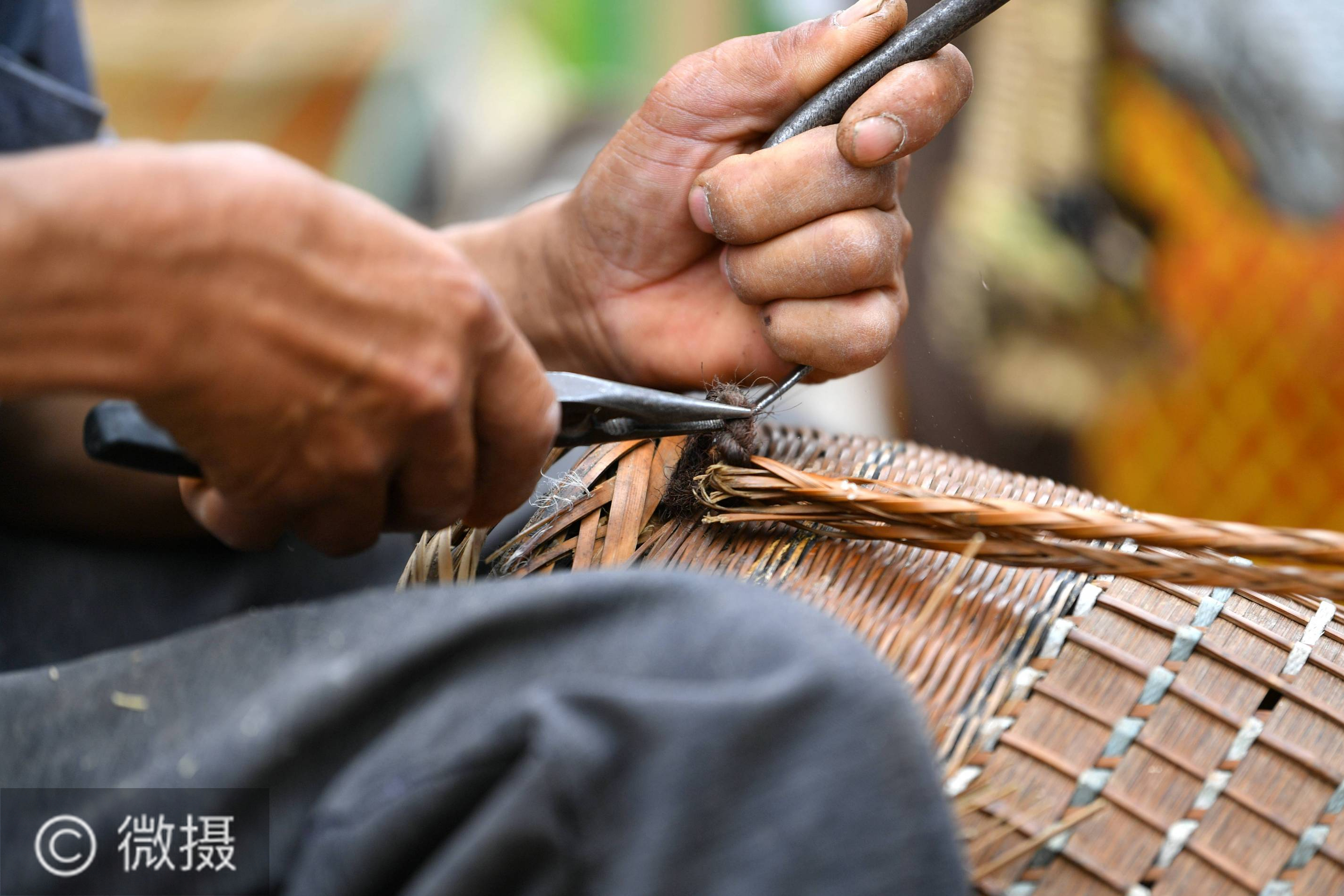6月11日,在湖北省宣恩县城民族路,篾匠宋兴武在维修。 在湖北省宣恩县,传承着湖北省非物质文化遗产“宣恩竹编”技艺的手艺人,用灵巧的双手为当地居民提供服务,满足百姓订做、维修竹篾制品的需要,成为当地一道独特的风景。新华社发(宋文 摄)