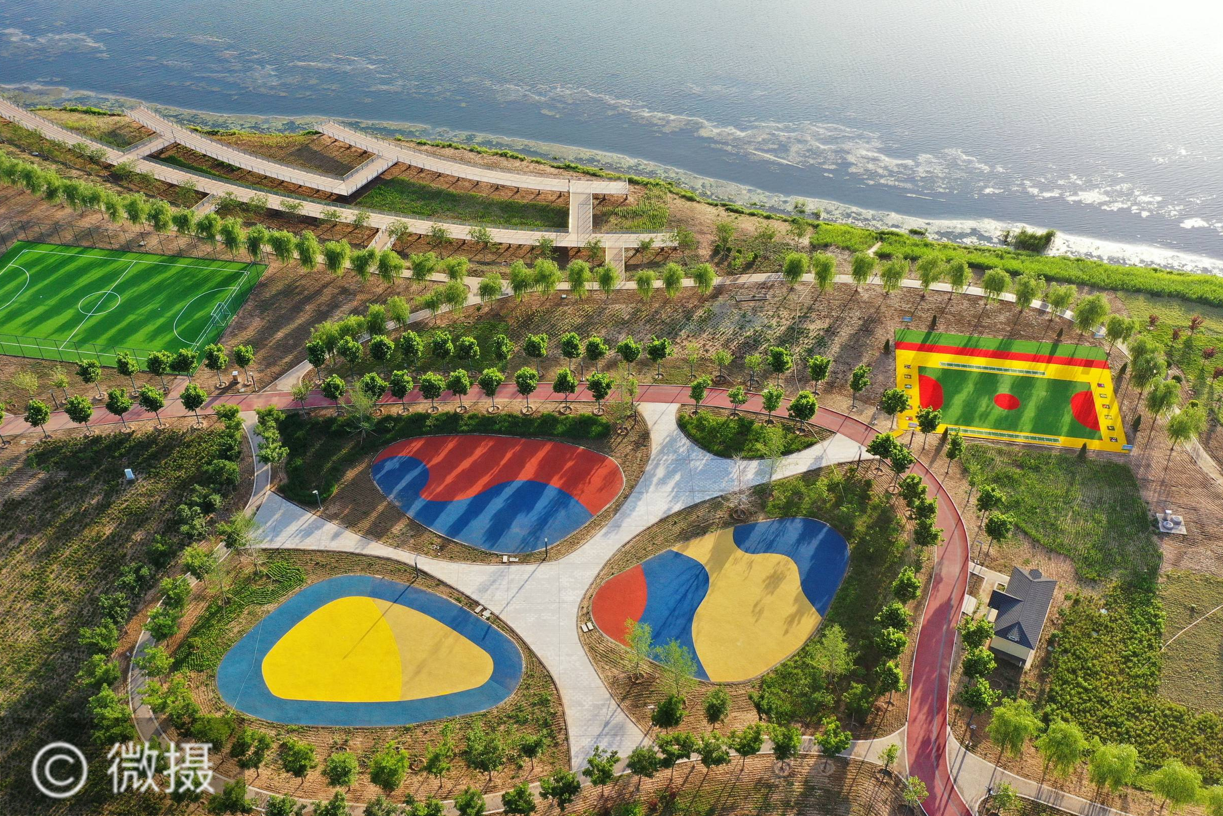 这是6月10日拍摄的河北省迁安市黄台湖水利风景区岸边的公园和体育运动场地。近年来,河北省迁安市推进“水美城市”建设,对滦河、三里河等多条河流进行综合治理,将治水与民生改善、产业发展、城市景观相结合。如今,迁安市黄台湖水利风景区成为城市一道道亮丽的风景线。新华社记者 牟宇 摄