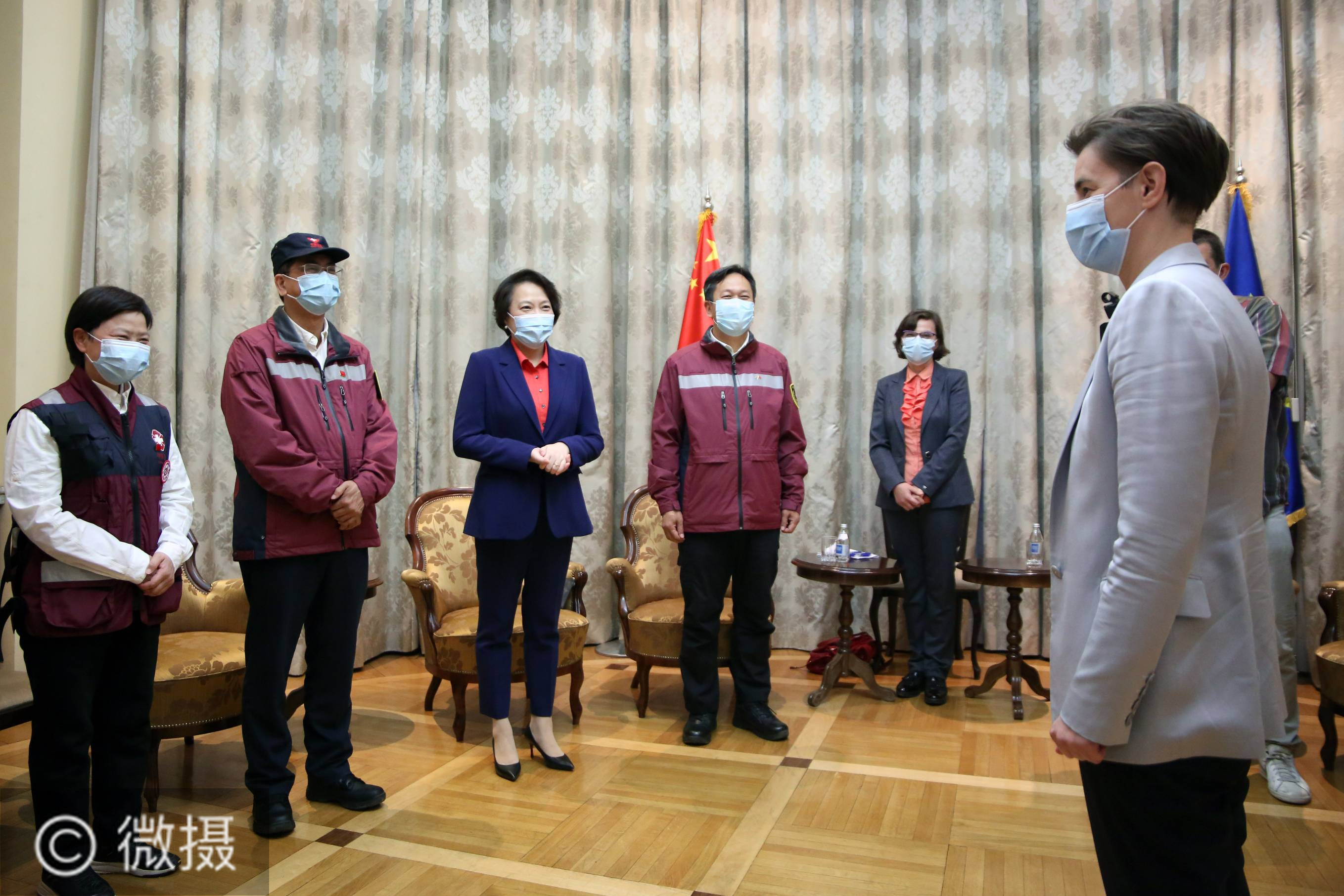 6月10日,在塞尔维亚首都贝尔格莱德,塞尔维亚总理布尔纳比奇(右)会见中国赴塞尔维亚抗疫医疗专家组成员。中国赴塞尔维亚抗疫医疗专家组11日结束在塞尔维亚近三个月工作,在首都贝尔格莱德机场乘机回国。塞尔维亚总理布尔纳比奇到机场送行。 新华社发(内马尼亚摄)