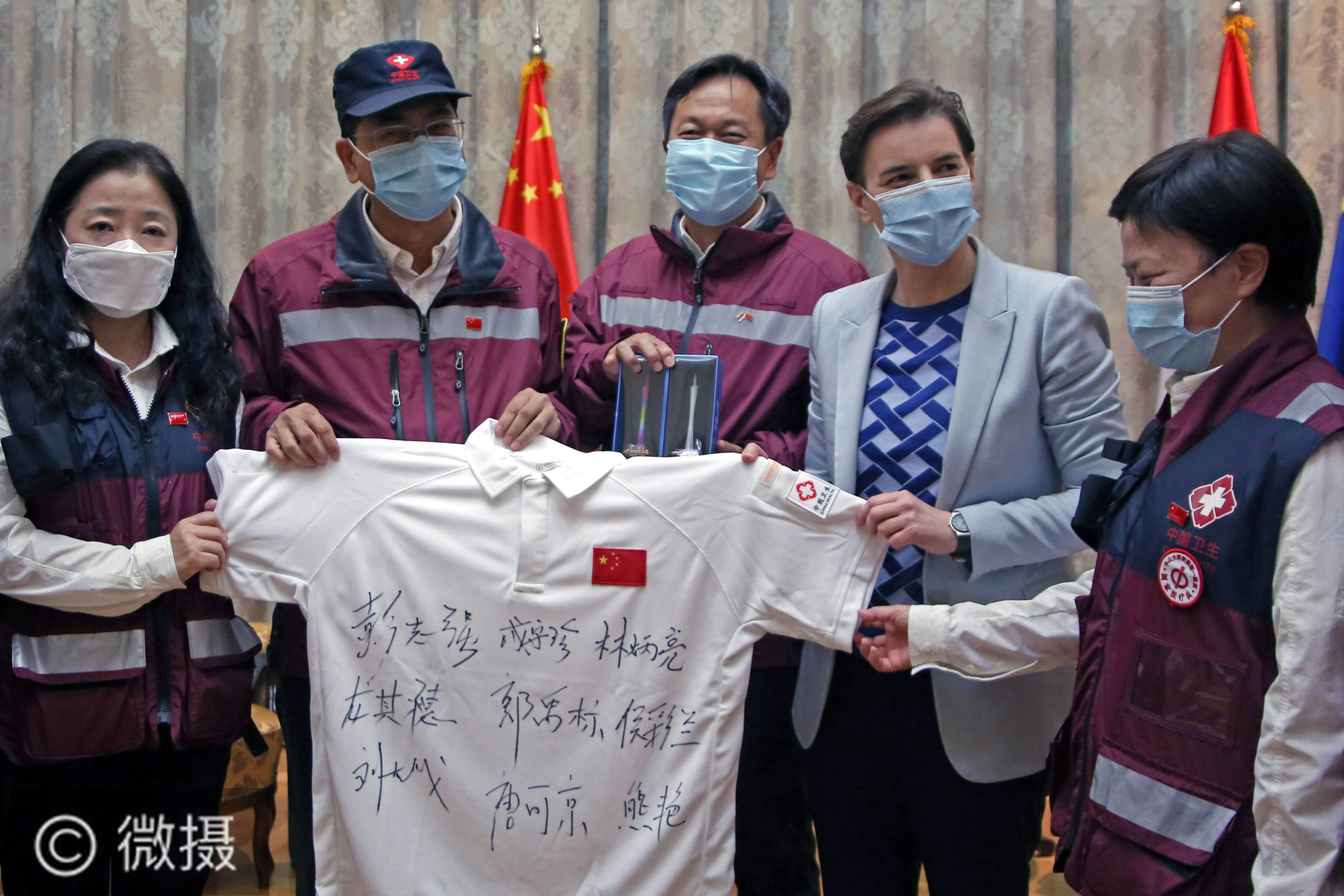 6月10日,在塞尔维亚首都贝尔格莱德,中国赴塞尔维亚抗疫医疗专家组向塞尔维亚总理布尔纳比奇(右二)赠送写有9名中国专家签名的衬衣。中国赴塞尔维亚抗疫医疗专家组11日结束在塞尔维亚近三个月工作,在首都贝尔格莱德机场乘机回国。塞尔维亚总理布尔纳比奇到机场送行。 新华社发(内马尼亚摄)