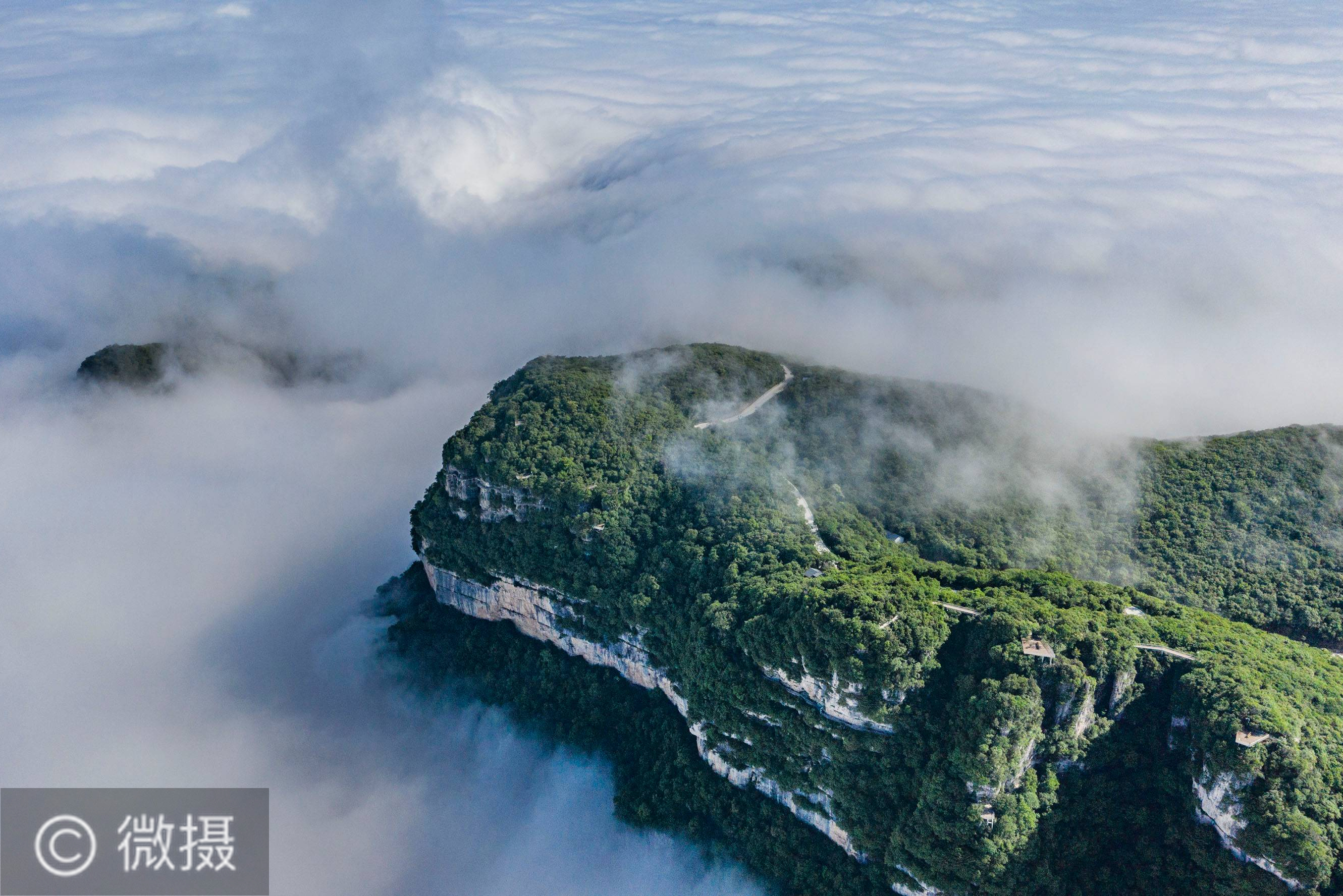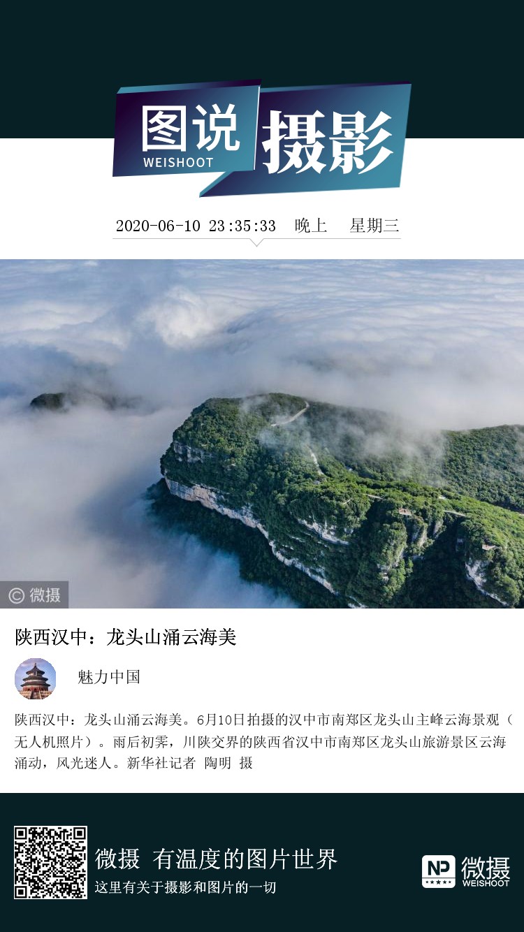 陕西汉中:龙头山涌云海美。6月10日拍摄的汉中市南郑区龙头山主峰云海景观(无人机照片)。雨后初霁,川陕交界的陕西省汉中市南郑区龙头山旅游景区云海涌动,风光迷人。新华社记者 陶明 摄