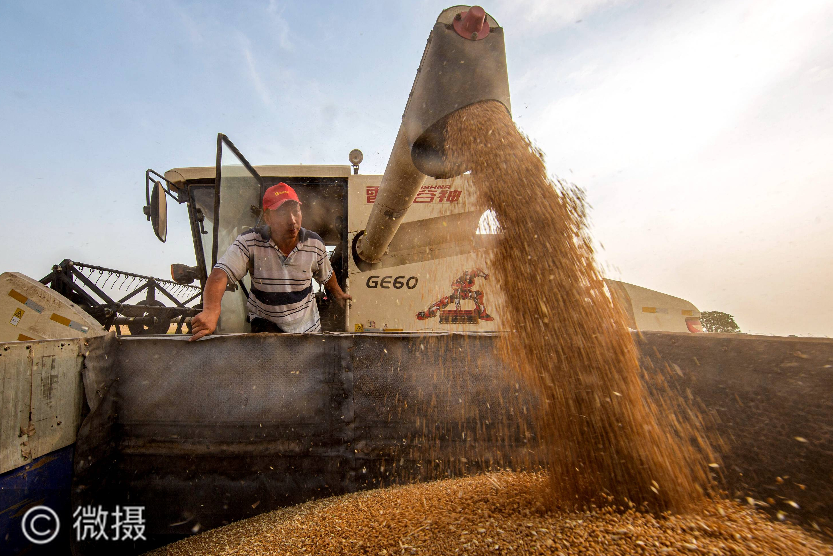 6月10日,在河北省武安市大同镇马会村,农机手操作机械设备收割小麦。“三夏”时节,华北平原麦田满目金黄,麦收工作进入高峰期。农民抓住天气晴好的有利时机抢收小麦,确保颗粒归仓。新华社记者 王晓 摄