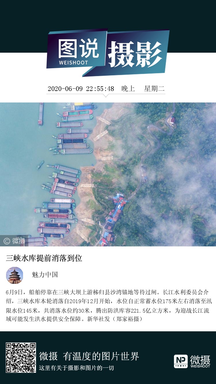 6月9日,船舶停靠在三峡大坝上游秭归县沙湾锚地等待过闸。长江水利委员会介绍,三峡水库本轮消落自2019年12月开始,水位自正常蓄水位175米左右消落至汛限水位145米,共消落水位约30米,腾出防洪库容221.5亿立方米,为迎战长江流域可能发生洪水提供安全保障。新华社发(郑家裕摄)