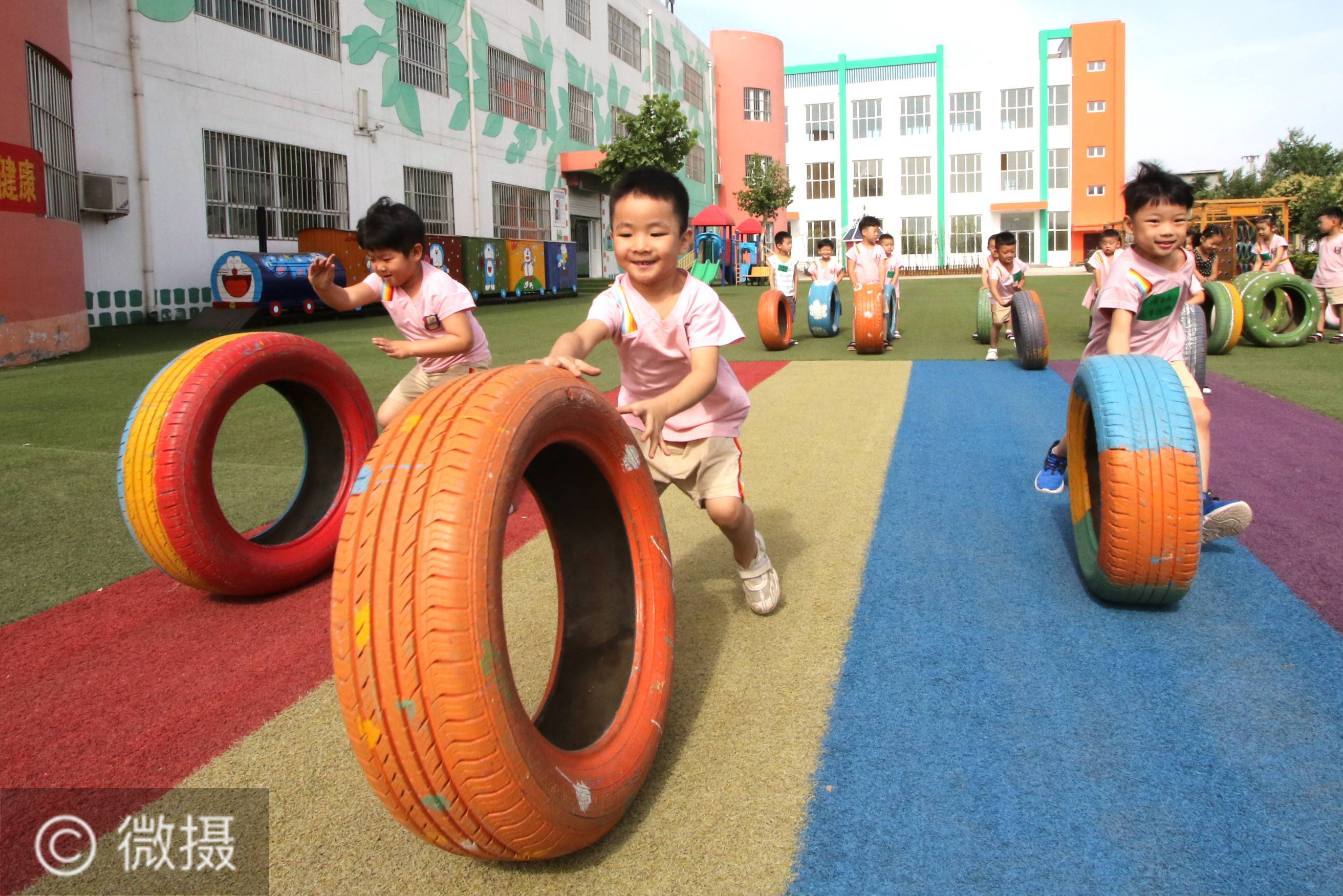 幼儿园开园啦!6月8日,河北省邯郸市永年区洺州幼儿园的孩子们在参加“滚轮胎”游戏。当日,部分地区具备开园条件的幼儿园陆续开园。新华社发(胡高雷 摄)新华社照片,邯郸(河北),2020年6月8日