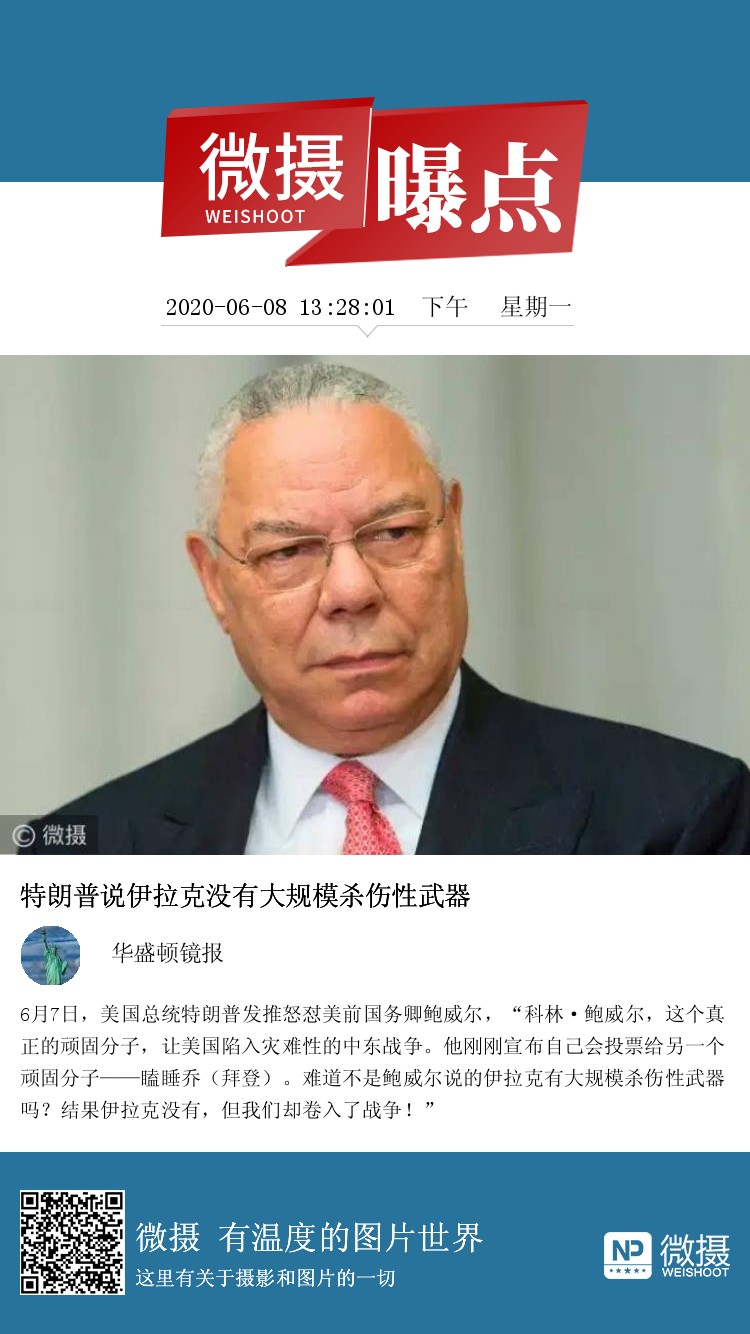 6月7日,美国总统特朗普发推怒怼美前国务卿鲍威尔,“科林·鲍威尔,这个真正的顽固分子,让美国陷入灾难性的中东战争。他刚刚宣布自己会投票给另一个顽固分子——瞌睡乔(拜登)。难道不是鲍威尔说的伊拉克有大规模杀伤性武器吗?结果伊拉克没有,但我们却卷入了战争!”