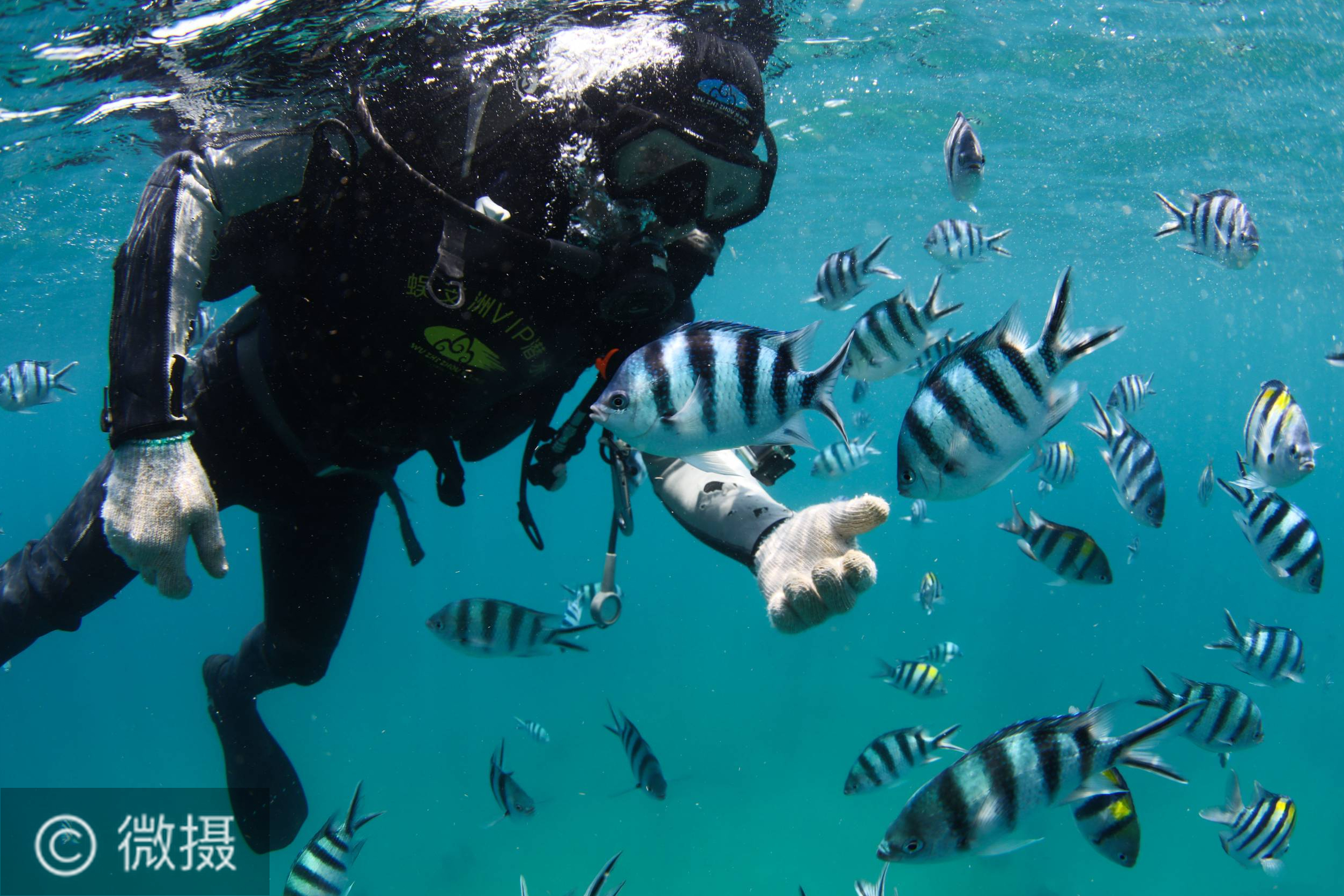 在海南三亚蜈支洲岛海域,旅游区工作人员即将下潜到海洋牧场进行作业(4月27日摄)。海南省三亚蜈支洲岛海域海洋牧场是海南首个国家级海洋牧场示范区,也是中国第一个位于热带地区的海洋牧场。新华社记者 杨冠宇 摄