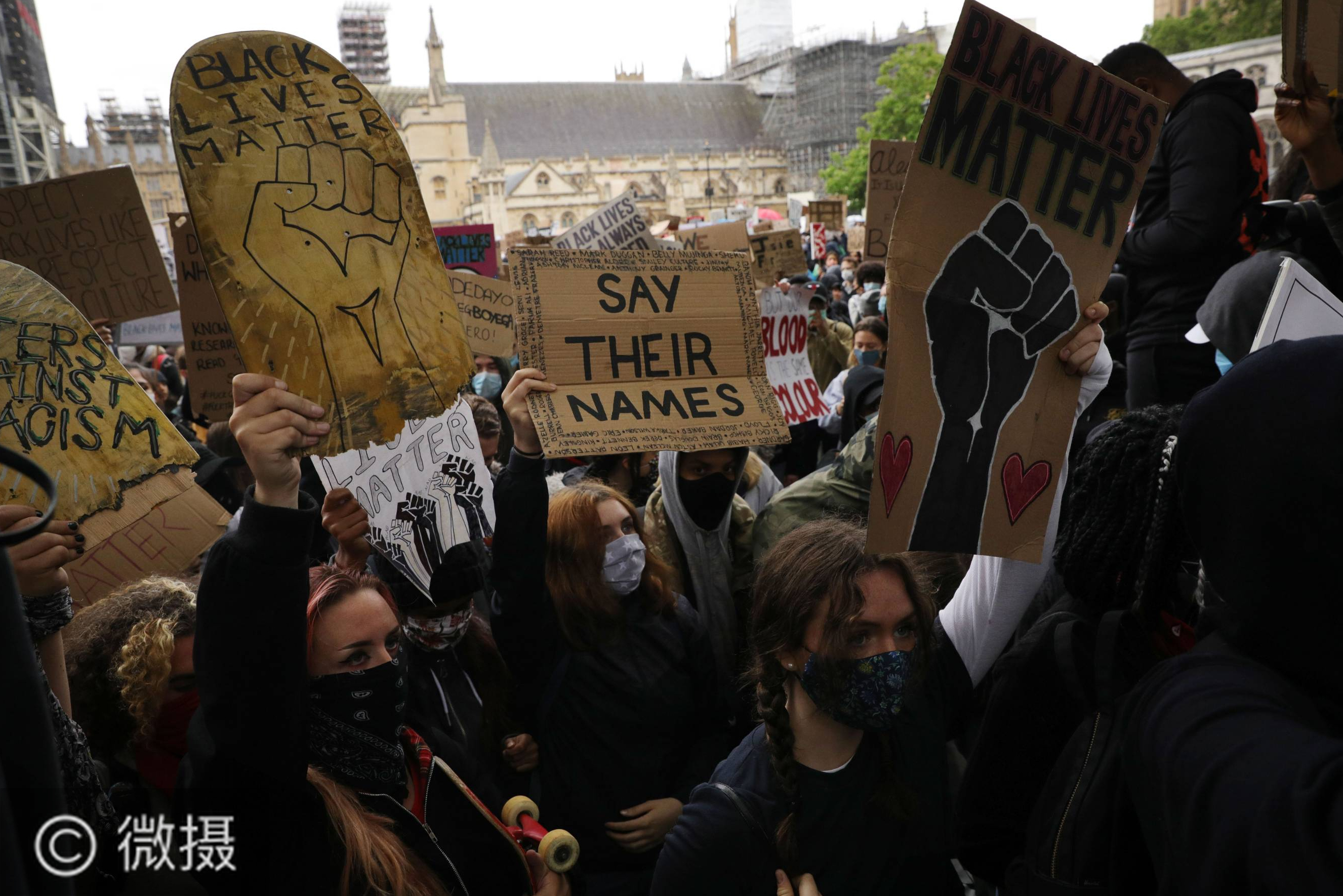 6月6日,一名女子戴着写有“我无法呼吸”字样的口罩在英国伦敦议会广场参加示威活动。英国民众6日在伦敦举行大型示威活动,抗议美国明尼阿波利斯市警察暴力执法致非裔男子乔治·弗洛伊德死亡和种族歧视。新华社发(蒂姆·爱尔兰摄)