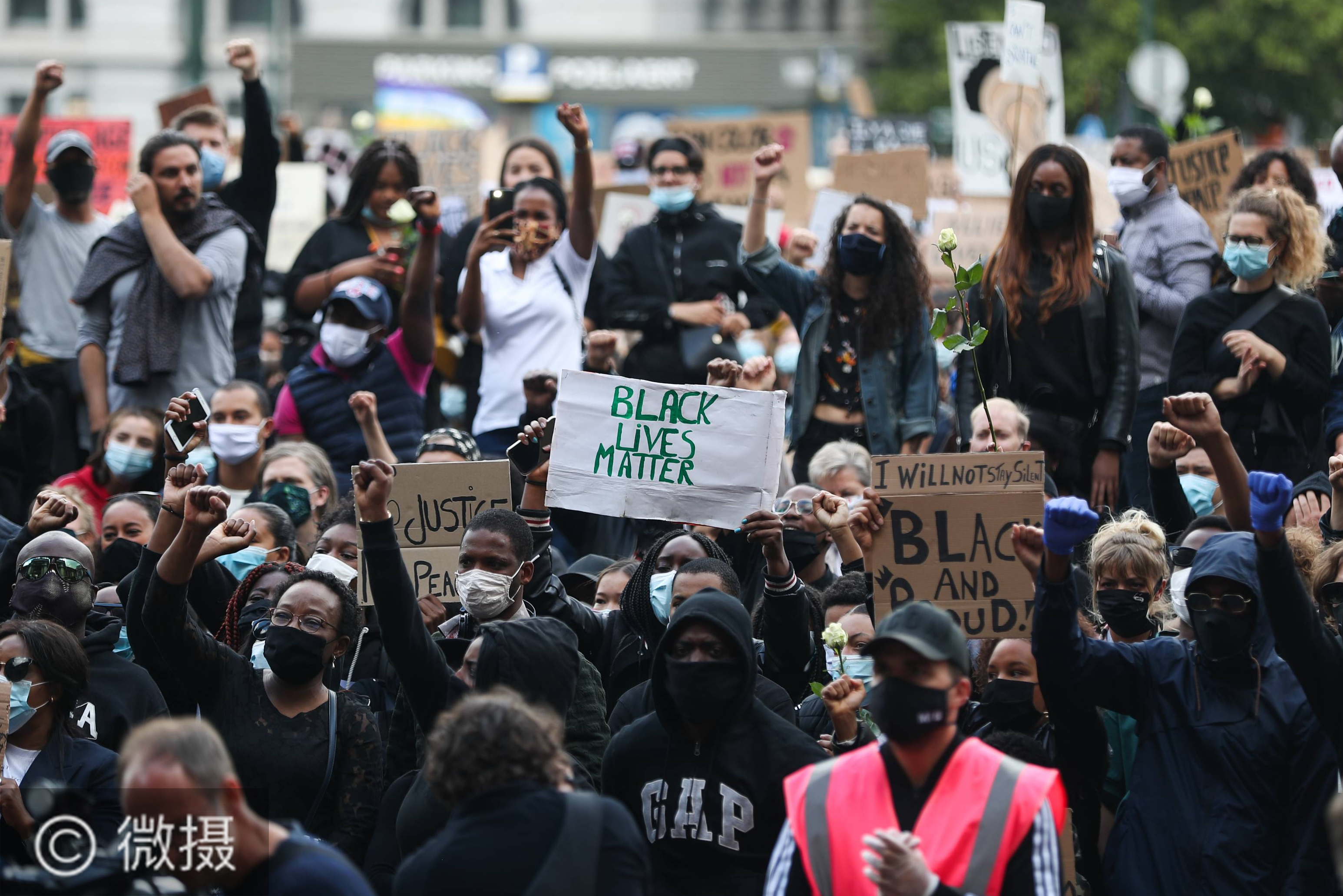 6月7日,民众在比利时布鲁塞尔市中心的司法宫附近参加示威活动。比利时民众当日在布鲁塞尔市中心的司法宫附近举行示威活动,抗议美国明尼阿波利斯市警察暴力执法致非裔男子乔治·弗洛伊德死亡。新华社记者 郑焕松 摄