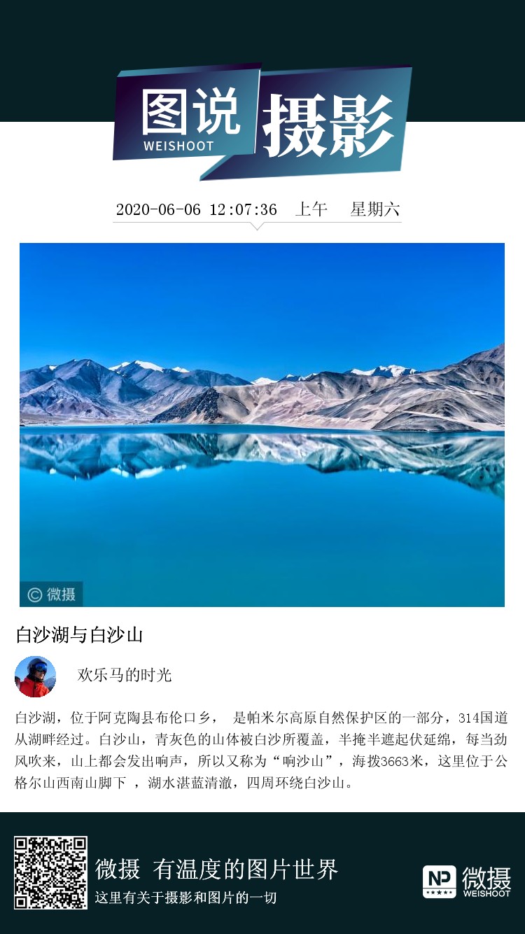 白沙湖,位于阿克陶县布伦口乡, 是帕米尔高原自然保护区的一部分,314国道从湖畔经过。白沙山,青灰色的山体被白沙所覆盖,半掩半遮起伏延绵,每当劲风吹来,山上都会发出响声,所以又称为“响沙山”,海拨3663米,这里位于公格尔山西南山脚下 ,湖水湛蓝清澈,四周环绕白沙山。