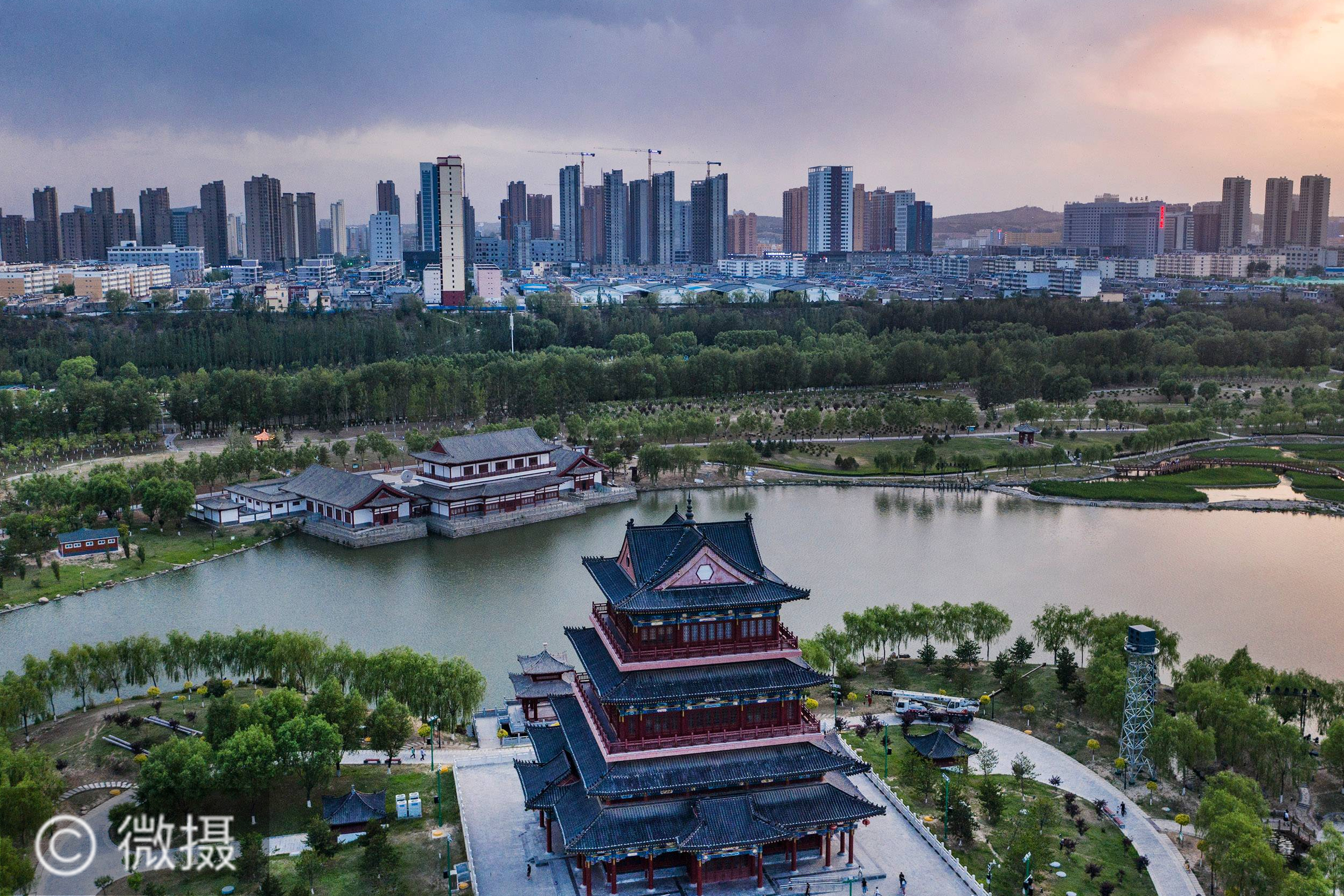6月4日拍摄的晚霞中的榆林市榆溪河生态长廊(无人机照片)。榆溪河畔,处处绿树成荫,呈现出一派“塞上森林城”的美景。毛乌素沙地是我国四大沙地之一,总面积4.22万平方公里,其中三分之一的面积在陕西省榆林市长城一线。新华社记者 陶明 摄
