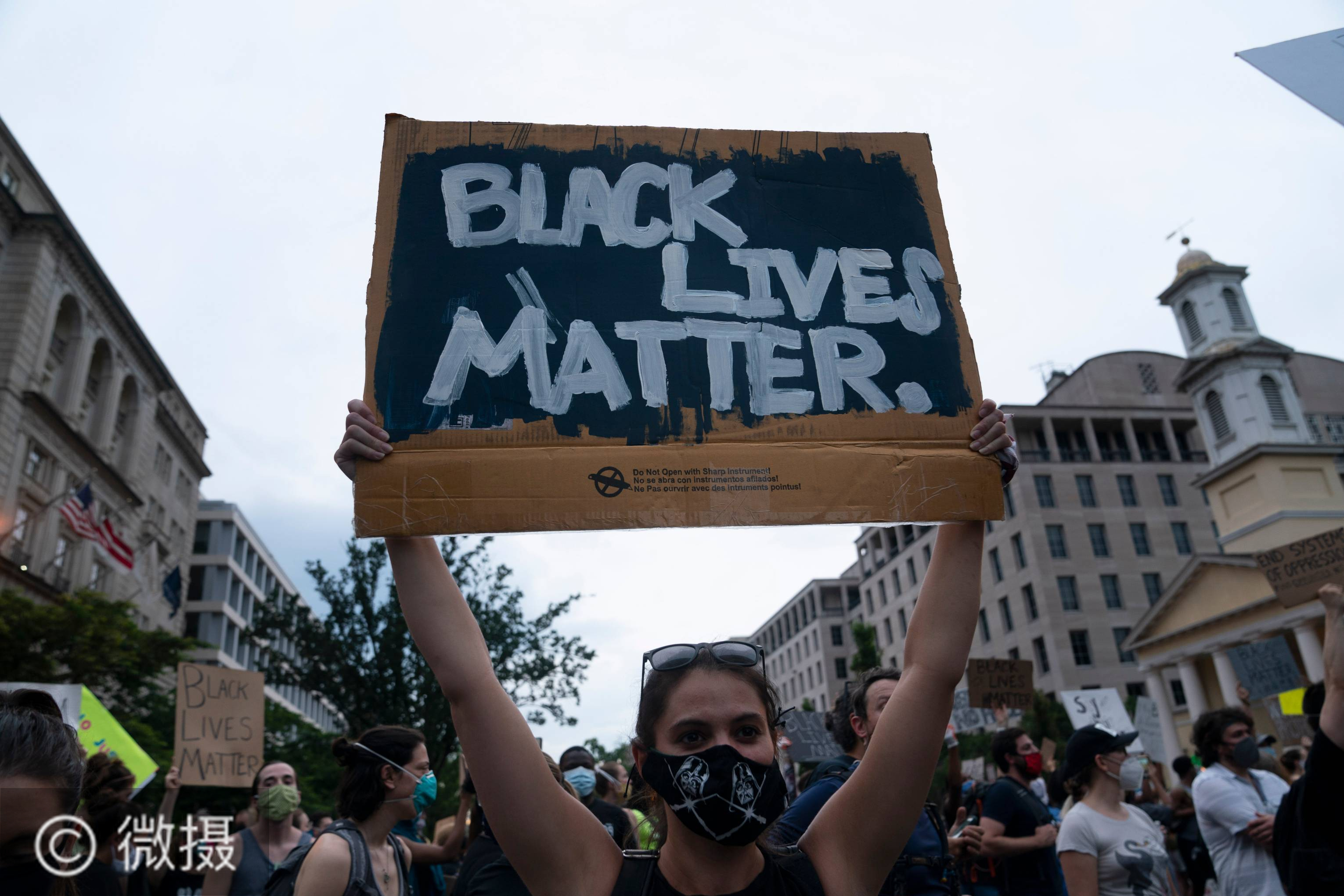 美国华盛顿抗议浪潮持续。6月4日,一名示威者手举“黑人的命也是命”的标语在美国华盛顿白宫前进行抗议。美国各地因弗洛伊德事件引发的抗议示威浪潮4日仍在持续。新华社记者 刘杰 摄