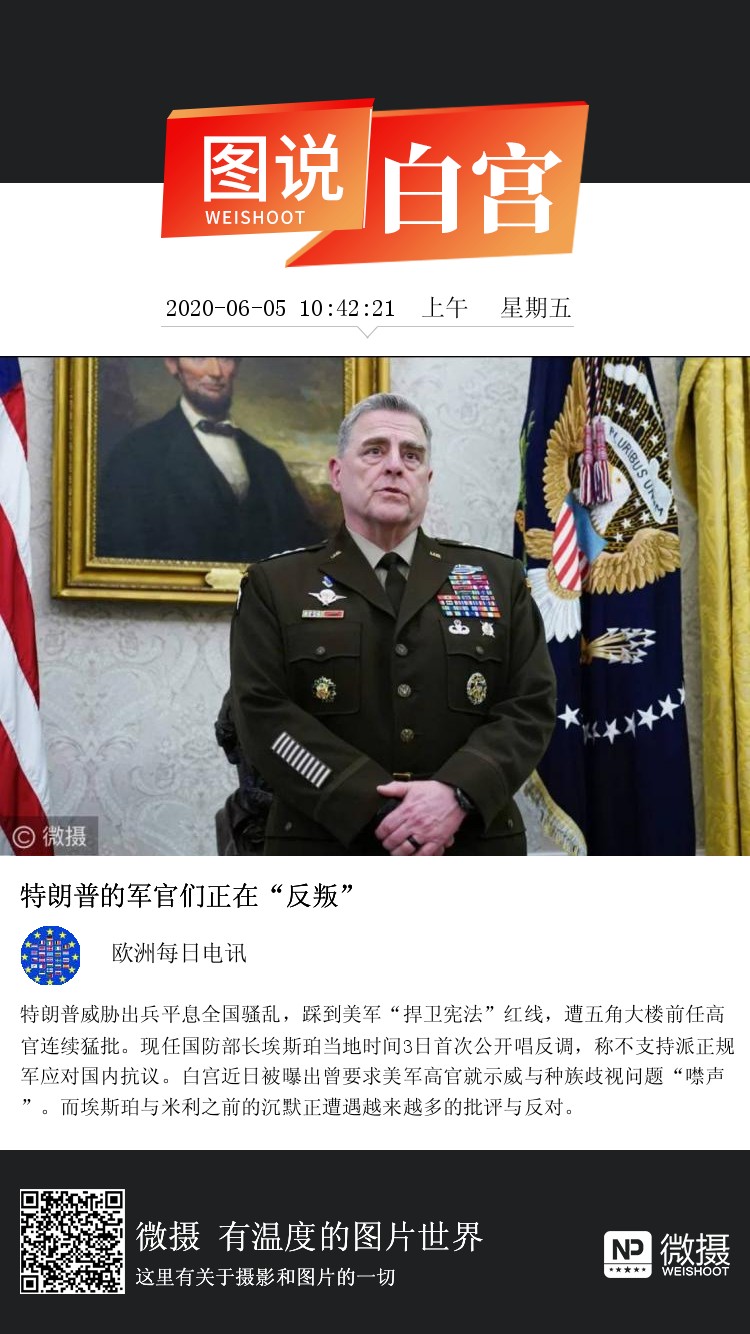 特朗普威胁出兵平息全国骚乱,踩到美军“捍卫宪法”红线,遭五角大楼前任高官连续猛批。现任国防部长埃斯珀当地时间3日首次公开唱反调,称不支持派正规军应对国内抗议。白宫近日被曝出曾要求美军高官就示威与种族歧视问题“噤声”。而埃斯珀与米利之前的沉默正遭遇越来越多的批评与反对。