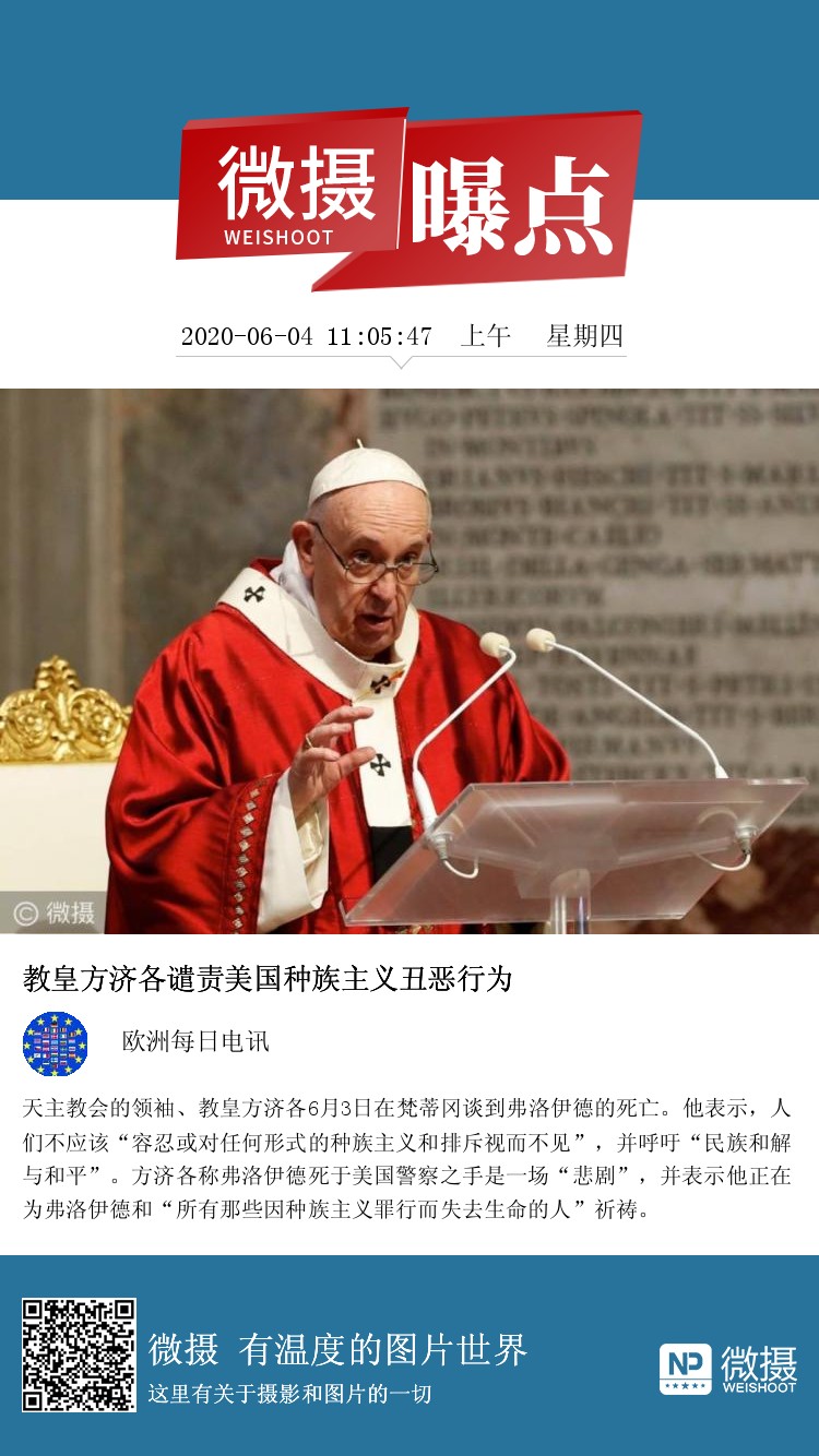 天主教会的领袖、教皇方济各6月3日在梵蒂冈谈到弗洛伊德的死亡。他表示,人们不应该“容忍或对任何形式的种族主义和排斥视而不见”,并呼吁“民族和解与和平”。方济各称弗洛伊德死于美国警察之手是一场“悲剧”,并表示他正在为弗洛伊德和“所有那些因种族主义罪行而失去生命的人”祈祷。