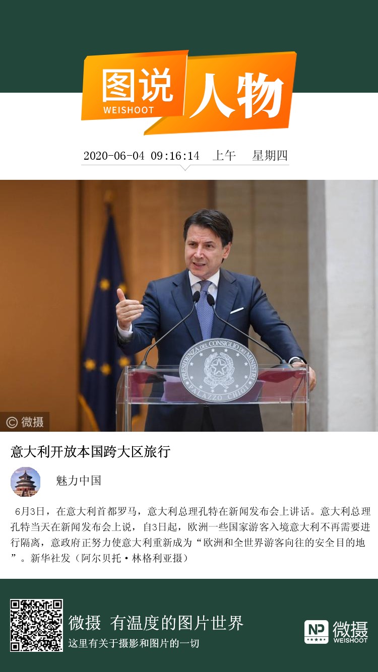 6月3日,在意大利首都罗马,意大利总理孔特在新闻发布会上讲话。意大利总理孔特当天在新闻发布会上说,自3日起,欧洲一些国家游客入境意大利不再需要进行隔离,意政府正努力使意大利重新成为“欧洲和全世界游客向往的安全目的地”。新华社发(阿尔贝托·林格利亚摄)