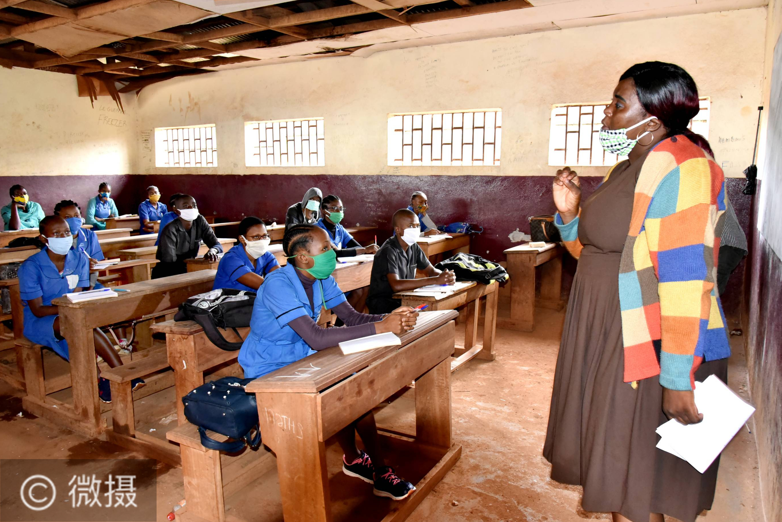 6月1日,在喀麦隆首都雅温得的一所学校,老师和学生在保持安全距离的情况下上课。非洲疾病预防控制中心2日发布数据显示,非洲各国已累计报告新冠确诊病例152442例,累计死亡4344例,累计治愈63661例。新华社发(科普索摄)