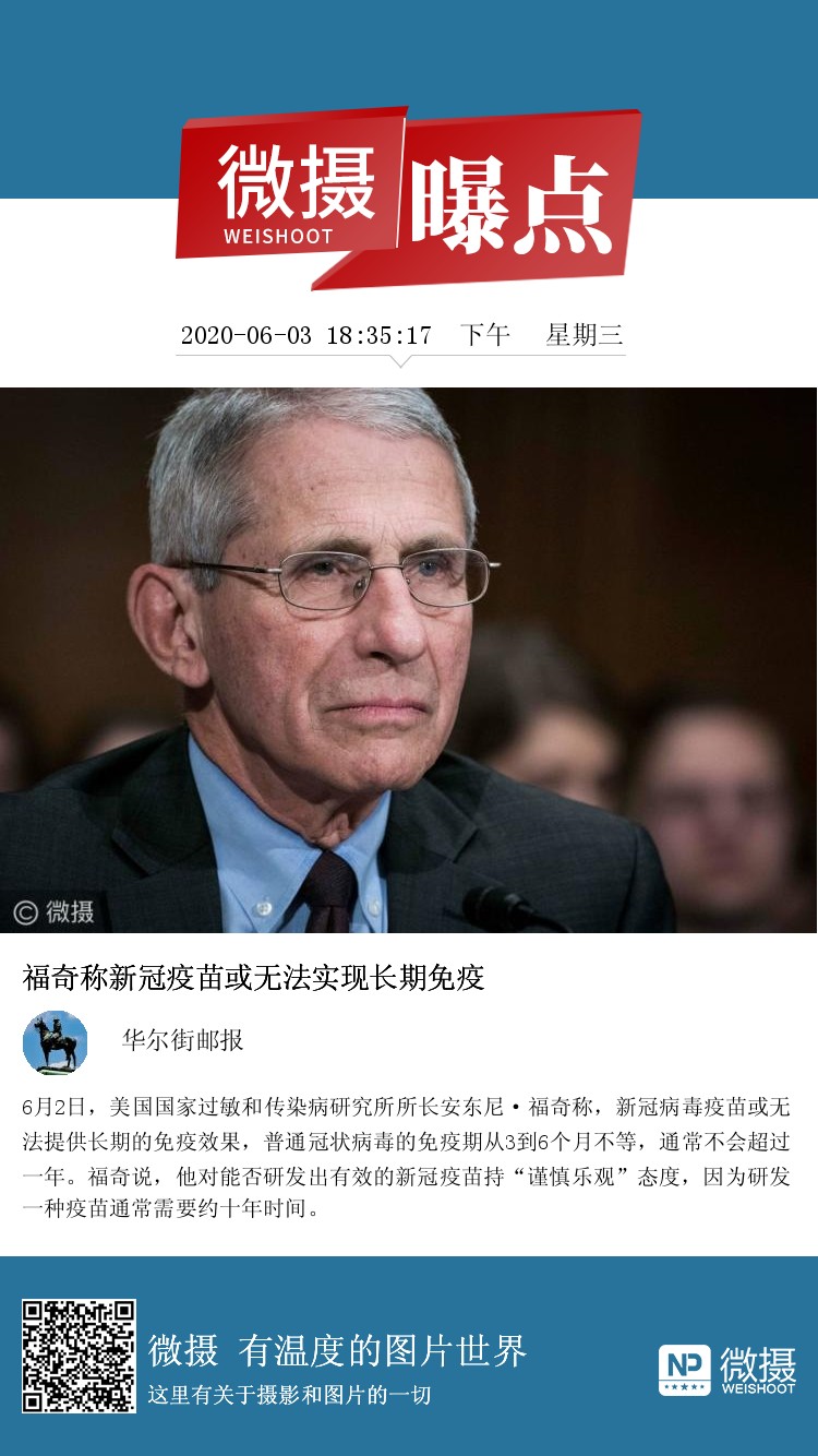 6月2日,美国国家过敏和传染病研究所所长安东尼·福奇称,新冠病毒疫苗或无法提供长期的免疫效果,普通冠状病毒的免疫期从3到6个月不等,通常不会超过一年。福奇说,他对能否研发出有效的新冠疫苗持“谨慎乐观”态度,因为研发一种疫苗通常需要约十年时间。