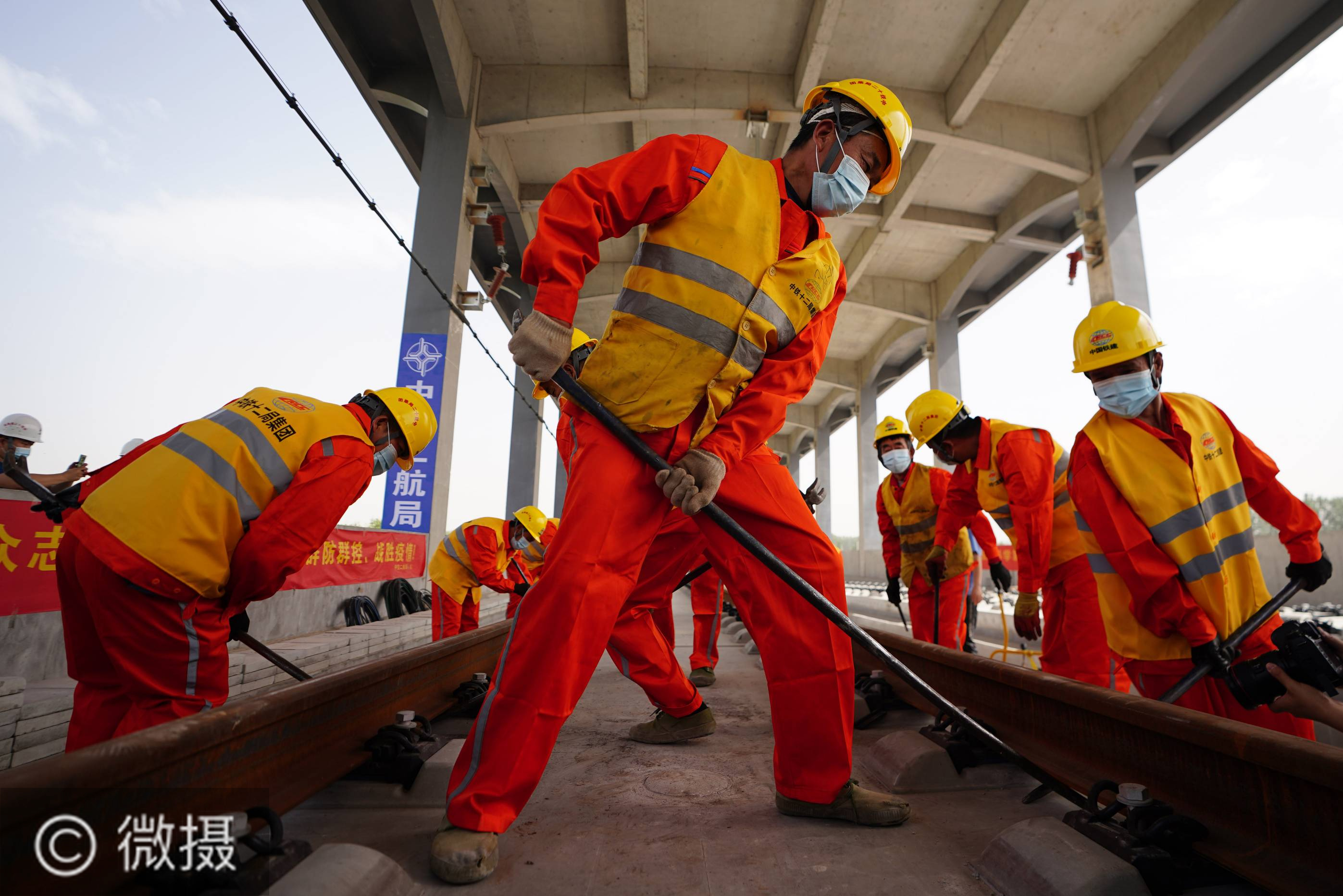 6月3日,工人在北京至雄安城际铁路(河北段)铺轨施工现场进行铺轨作业。当日,在北京至雄安城际铁路(河北段)铺轨施工现场,一组500米长钢轨平稳落在无砟道床上,标志着京雄城际铁路(河北段)建设进入铺轨阶段。京雄城际铁路预计2020年底开通运营。新华社记者 邢广利 摄