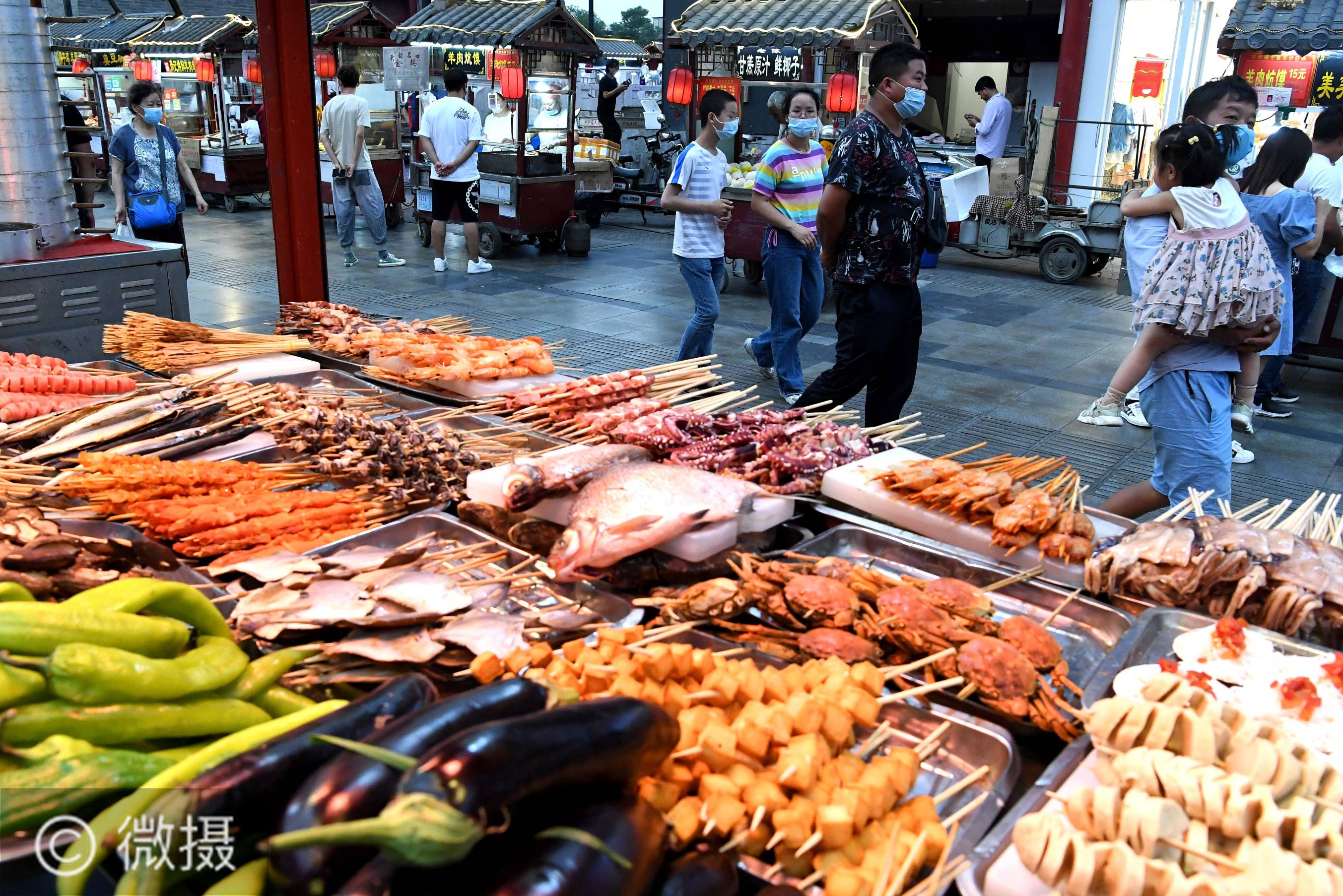 6月2日,在河南省开封市鼓楼夜市,食客从烧烤摊位前经过。近日,河南省开封市鼓楼夜市在关闭4个月后恢复开放。近200个摊位整齐排开,各色小吃琳琅满目,烹炒的火苗、蒸腾的热气、不绝于耳的叫卖声……古色古香的广场上重现欢腾的烟火气。新华社记者 李安 摄