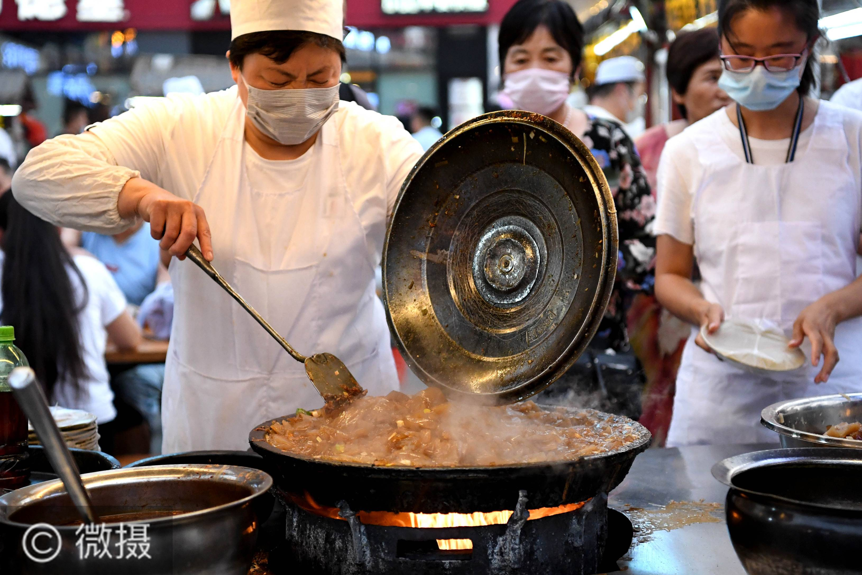 6月2日,在河南省开封市鼓楼夜市,一名小吃摊主在制作传统小吃炒凉粉。近日,河南省开封市鼓楼夜市在关闭4个月后恢复开放。近200个摊位整齐排开,各色小吃琳琅满目,烹炒的火苗、蒸腾的热气、不绝于耳的叫卖声……古色古香的广场上重现欢腾的烟火气。新华社记者 李安 摄